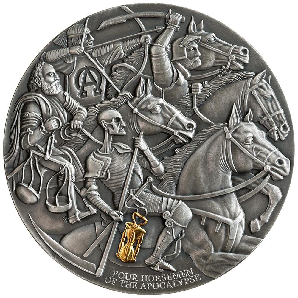 As the Book reveals the order of events, so does the series start with “The Four Horsemen of the Apocalypse” coin. This coin is struck from 3 oz of .999 silver with the exceptional relief imprinted image of each Horseman and their fierce duty to spread calamities around the world: Conquest, War, Famine and Death. The harshness and determination of these characters embedded in cold silver shows no mercy upon the living. And the gold hourglass of Death counts the time before the Last Judgment for us all.