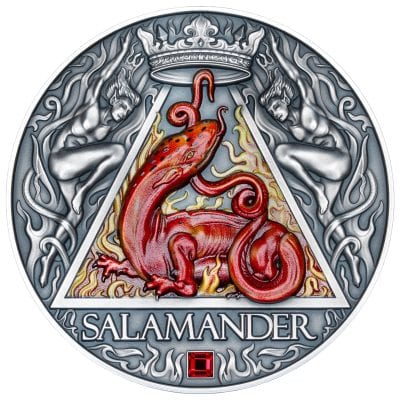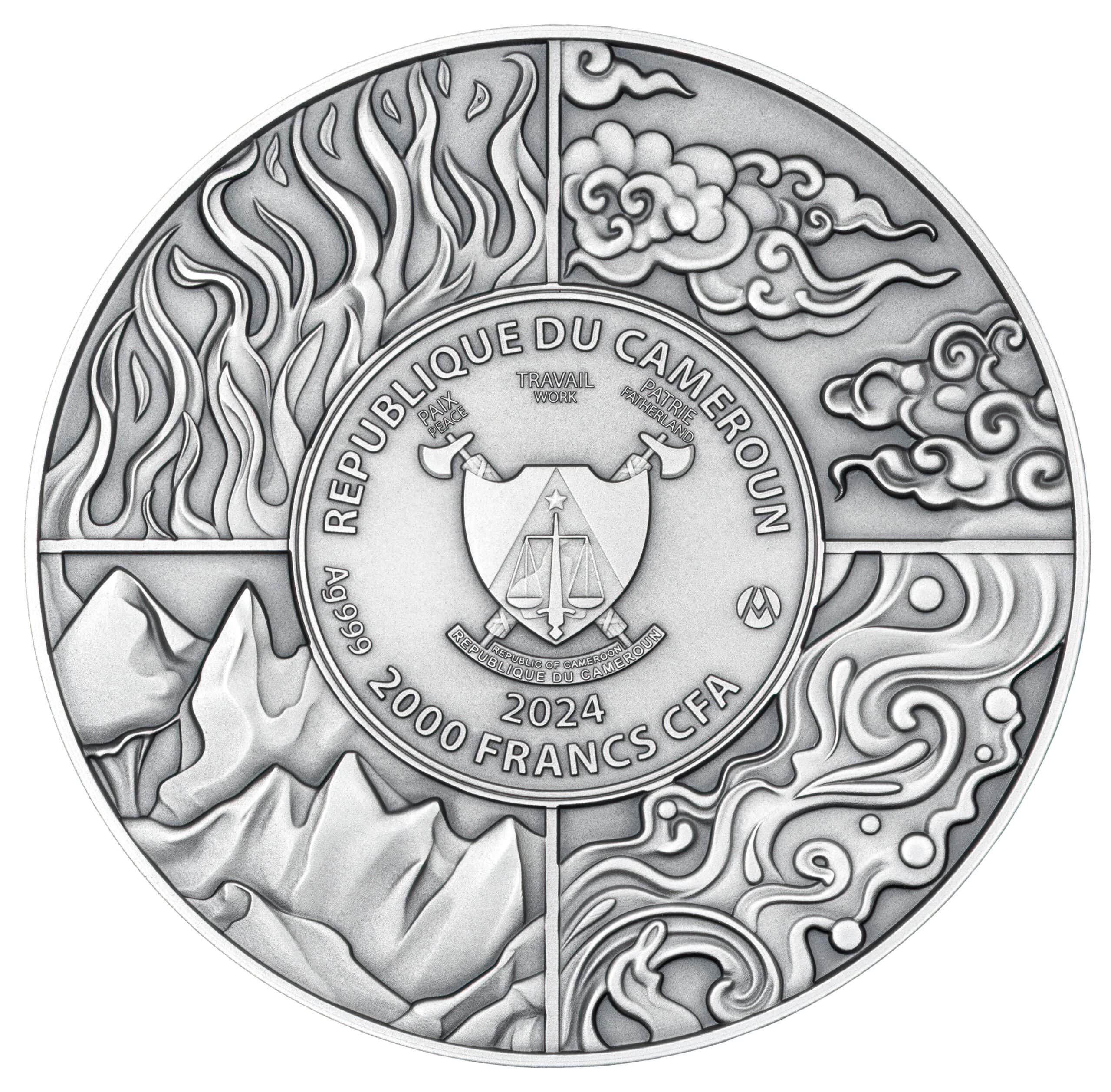 This new 2 Oz Silver coin is part of the “Four Elementals” series. The reverse of the coin features an artistic image of the mythological creature Salamander, the symbol of the element Fire and a crystal inlay. The obverse of the coin features the Coat of Arms of Cameron and the inscriptions: “REPUBLIQUE DU CAMEROUN” – the issuing country, “2000 FRANCS CFA” – the face value and “2024” – the year of issue. All around the obverse, there are four elements representing one of each elemental that is a part of the series.