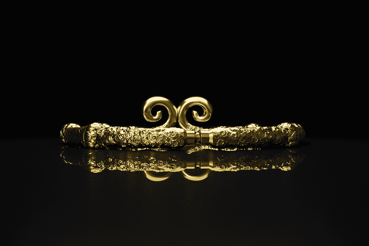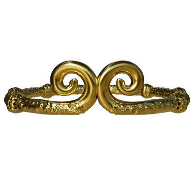 The legend of the Golden Headband tells of Sun Wukong, the rebellious Monkey King, whose defiance of the heavens led to the creation of a mystical headband forged by the Buddha. Adorned with gold gilding and spirals, this headband, measuring 180mm in diameter and 35mm thick, was meant to control his power by tightening at the slightest defiance, forcing him to confront his unruly nature and learn humility.