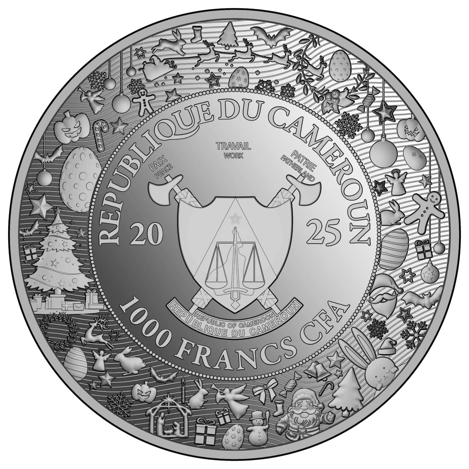 The obverse side of the coin depicts the unique coat of arms for Cameroon. Surrounding the coat of arms there are various elements related to events celebrated with family. The coat of arms has the inscriptions: “REPUBLIQUE DU CAMEROUN” (country of issue), “2025” (the year of issue) and “1000 FRANCS CFA” (the face value).