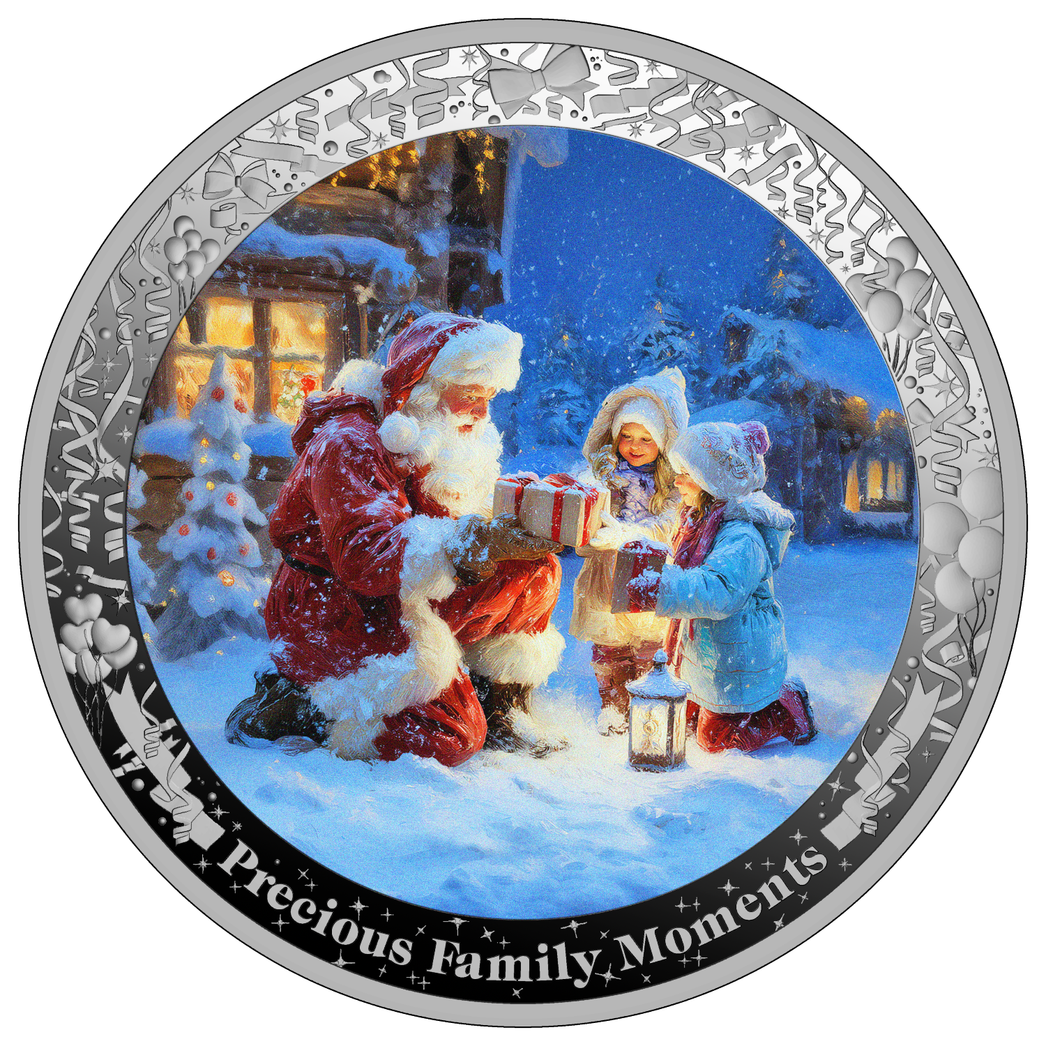 In the middle of the reverse is a high resolution printed “Christmas Santa Giving Gifts” image. Around the image is a circle of elements which appears on each of the coins. At the bottom the series name “PRECIOUS FAMILY MOMENTS” is written.