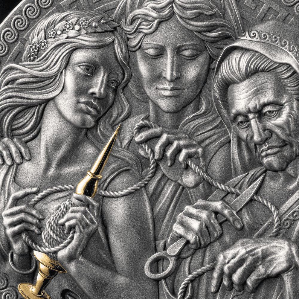 The Moirai, the three fates of Greek mythology, grace the masterfully crafted 1 oz