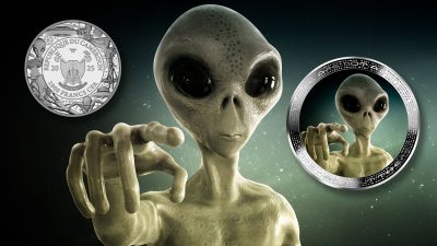 In the middle of the reverse is a high resolution printed “Alien Face” image. Around the image is an digital alien signal around the main image comes back on each of the coins. At the top and bottom the series name “WE ARE NOT ALONE” and “THEY ARE OUT THERE” is written.