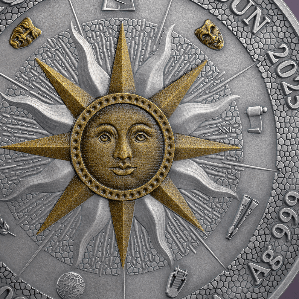 texture and historical depth. On the obverse, digital gilding highlights each muse’s symbolic