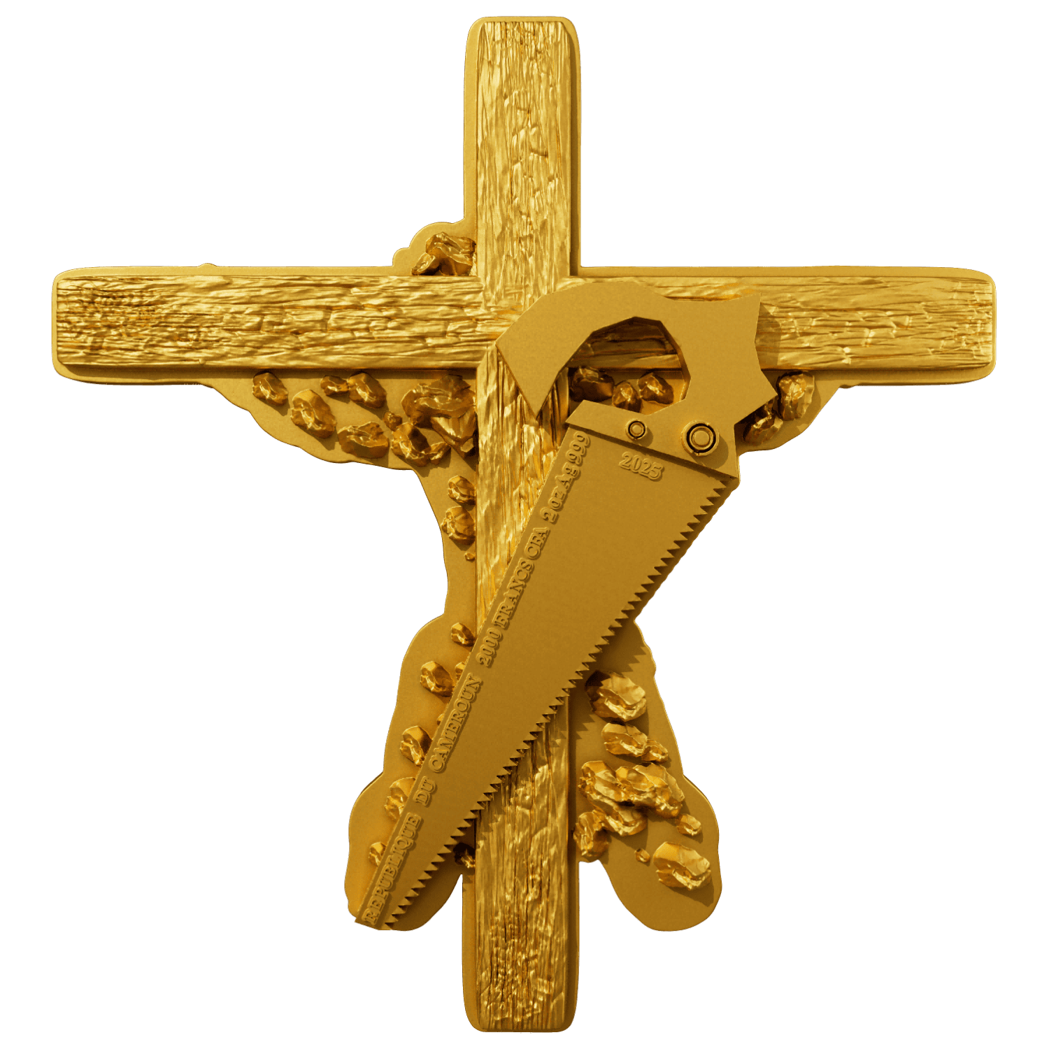 The St. James the Less Coin is the eleventh release in the esteemed 12 Apostles Series, strikingly crafted in 2 oz of .999 fine silver with a limited mintage of just 199 pieces. Measuring 60 mm by 65 mm and issued by the Republic of Cameroon, this collectible is offered in both antique and gold-gilded finishes. The obverse features a minimalist yet potent depiction of a carpenter’s saw laid diagonally across a rugged wooden cross—symbolizing the martyr’s instrument—surrounded by sculpted stones that evoke the trials endured by early believers. Inscriptions along the blade and wood include “St. James the Less,” the year “2025,” silver purity, face value, and issuing authority. The antique finish lends a weathered reverence, while the gold-gilded version imparts a sacred dignity, transforming brutal symbolism into a reflection of holy sacrifice.