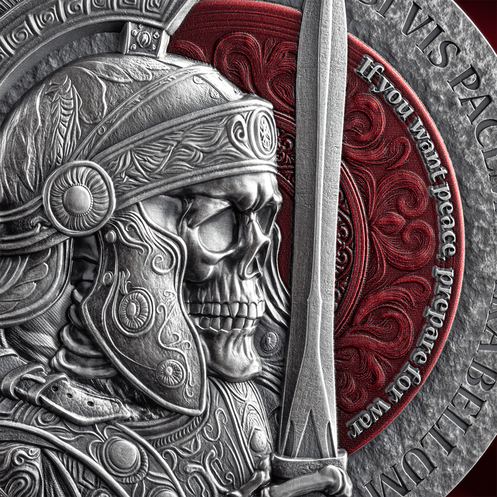 war, while a menacing Roman legionary with a skeletal face stands as a symbol of the