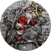 Introducing the Steampunk Santa Coin: A Fusion of Tradition and Mechanical Marvel, the second release in our extraordinary series that reimagines beloved legends with a mechanized twist. Crafted from 2 oz of .999 fine silver and limited to only 199 pieces, this 50 mm coin by the République du Cameroun blends the magic of Christmas with industrial innovation. On the obverse, Santa’s iconic boot is intricately adorned with metal gears, rivets, and mechanical enhancements, set against a backdrop of gift boxes, frosted bows, and delicate snowflakes, highlighted by a rich red metallic finish and emblematic snowfall. The reverse showcases Santa riding a mechanical reindeer, featuring golden foil antlers and detailed gearwork, immersed in a snow-covered, gear-laden landscape that symbolizes strength and ingenuity. With its selective gold foil, vibrant color accents, and meticulous embossing, the Steampunk Santa Coin is a unique treasure for steampunk enthusiasts and collectors alike, embodying the enchanting blend of tradition and machinery that defines the holiday season.