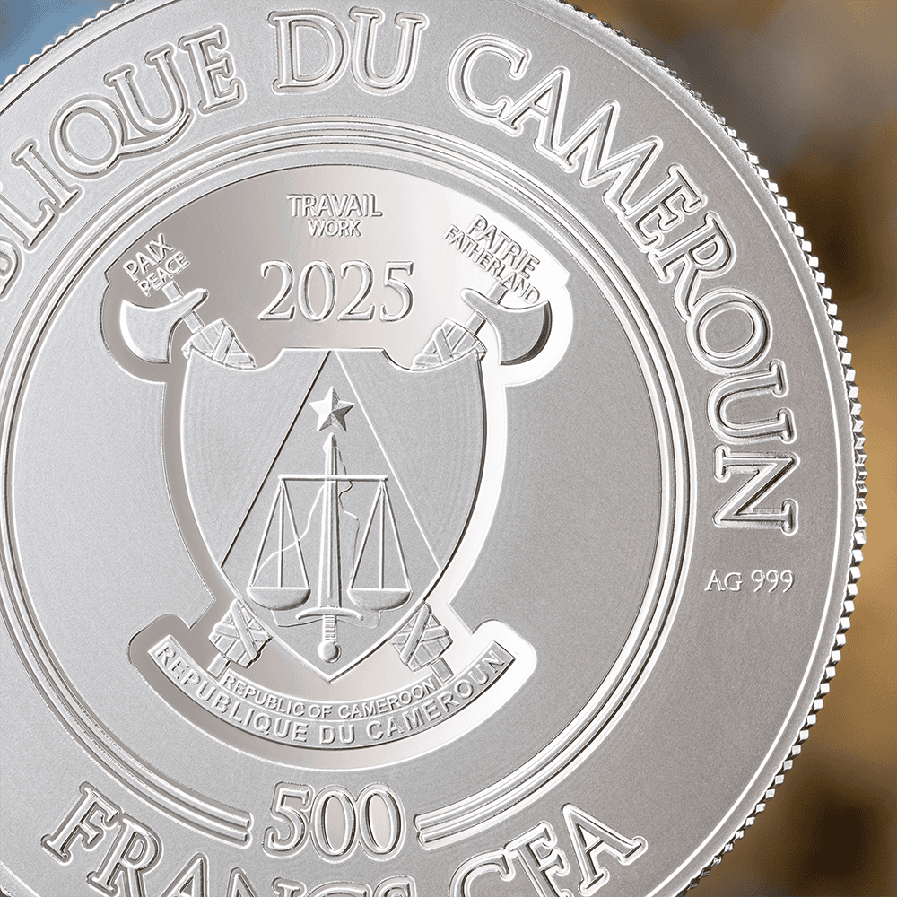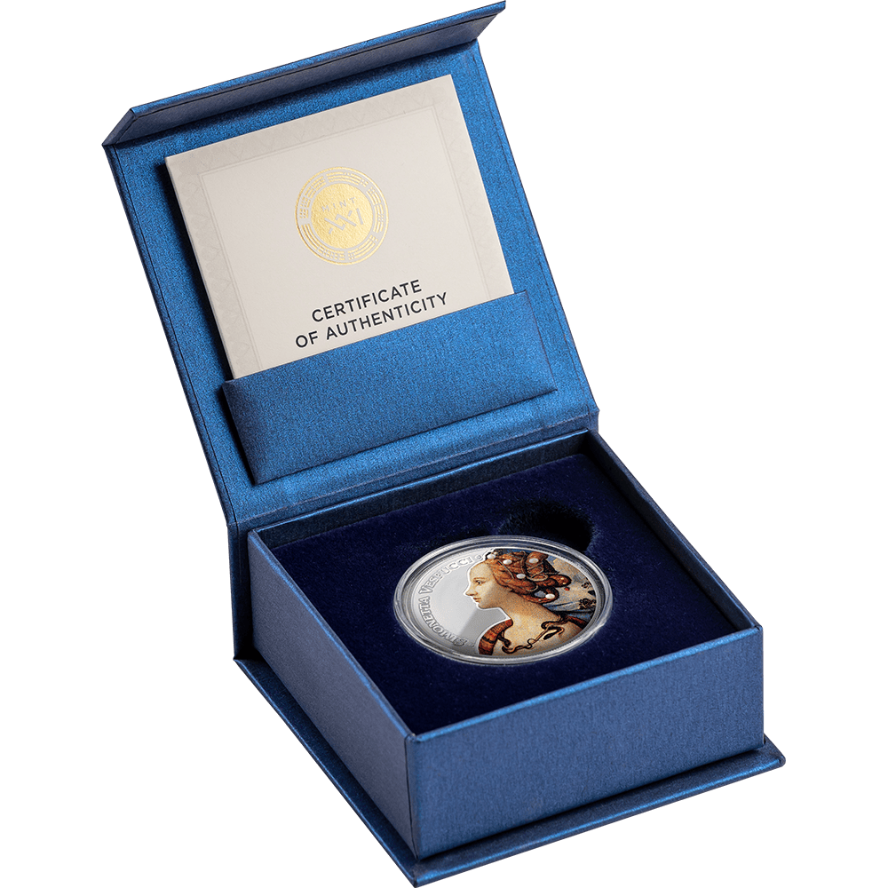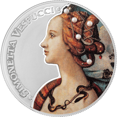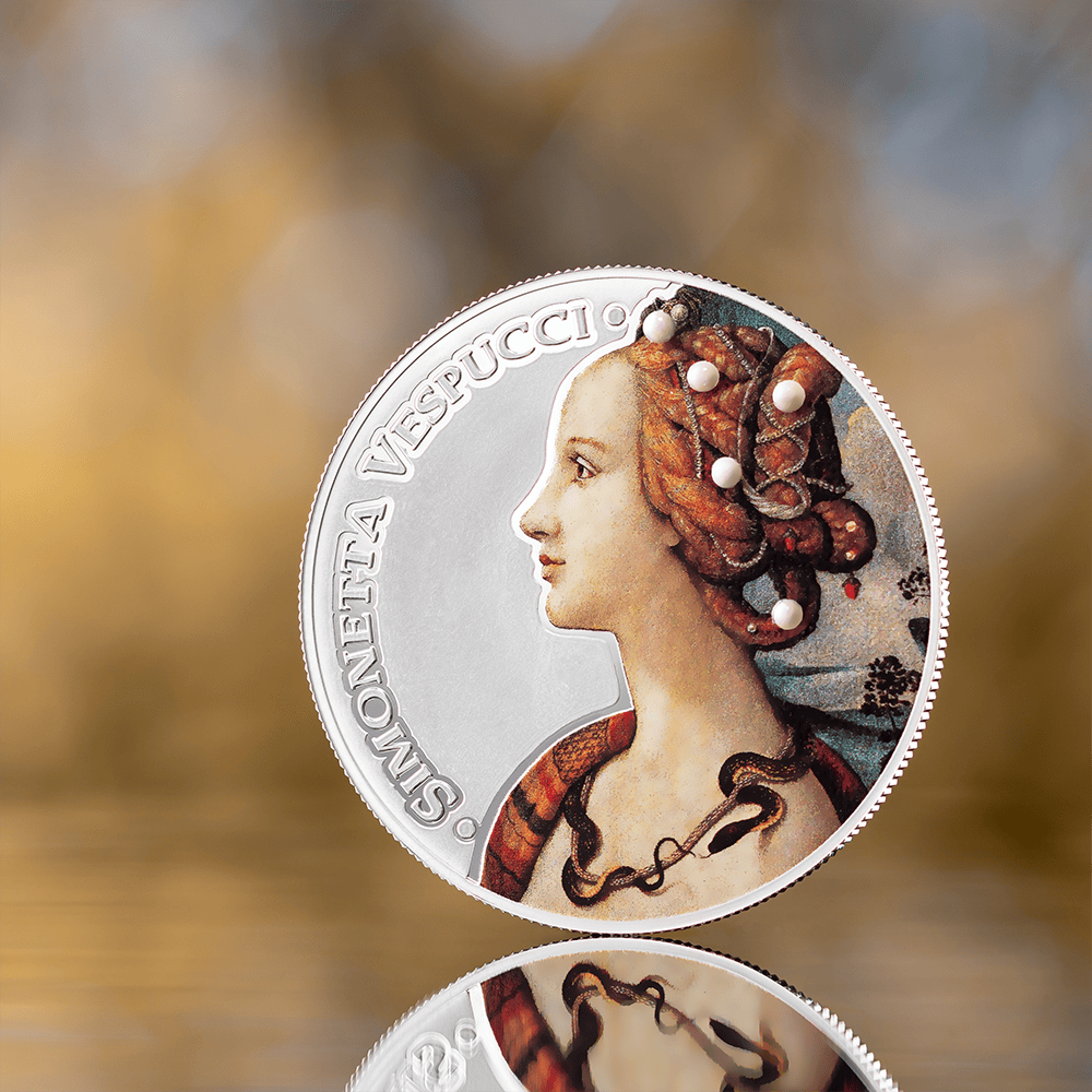 Delicate gem inserts replicate the pearls and jewels in her hair, enhancing the coin’s elegant