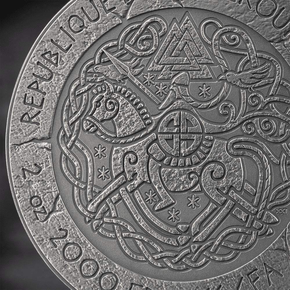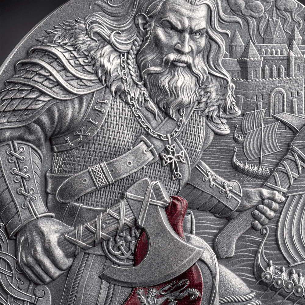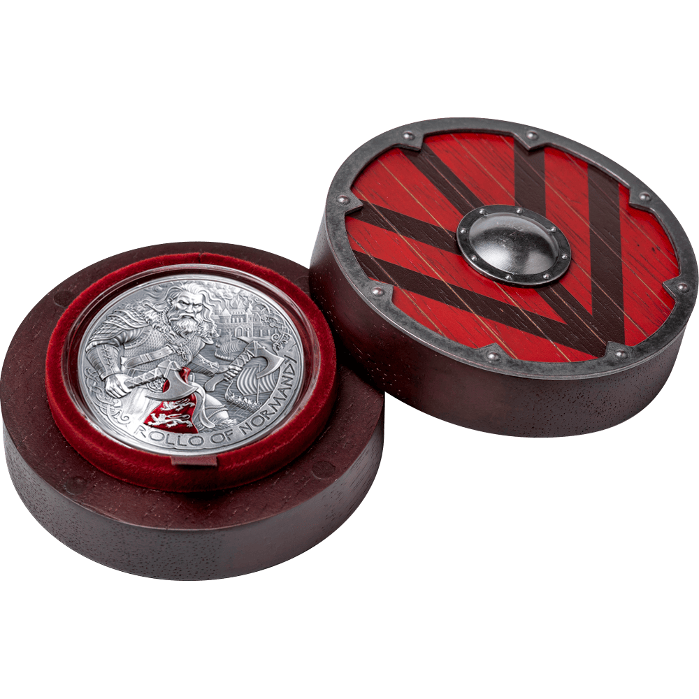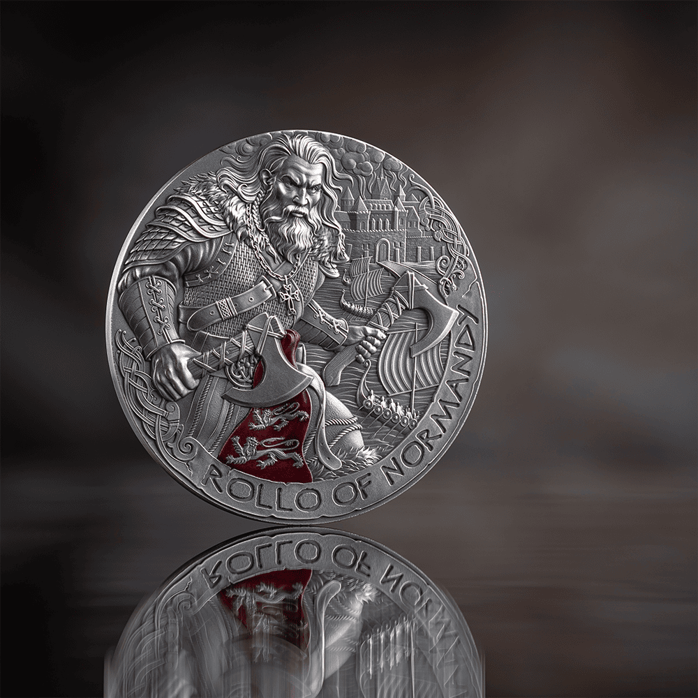 Struck from 2 ounces of .999 fine silver in antique finish, the coin reveals Rollo’s commanding presence