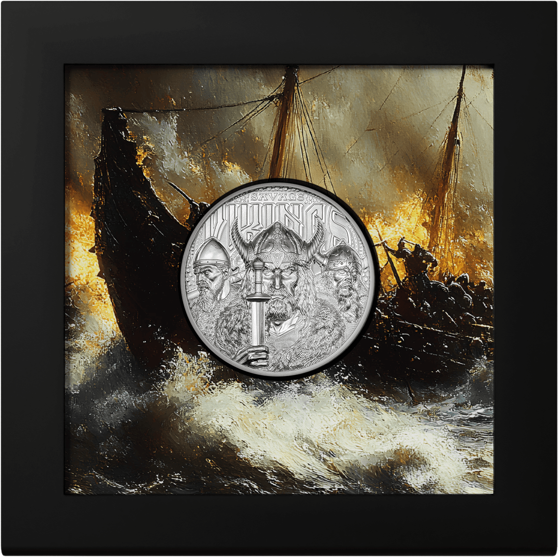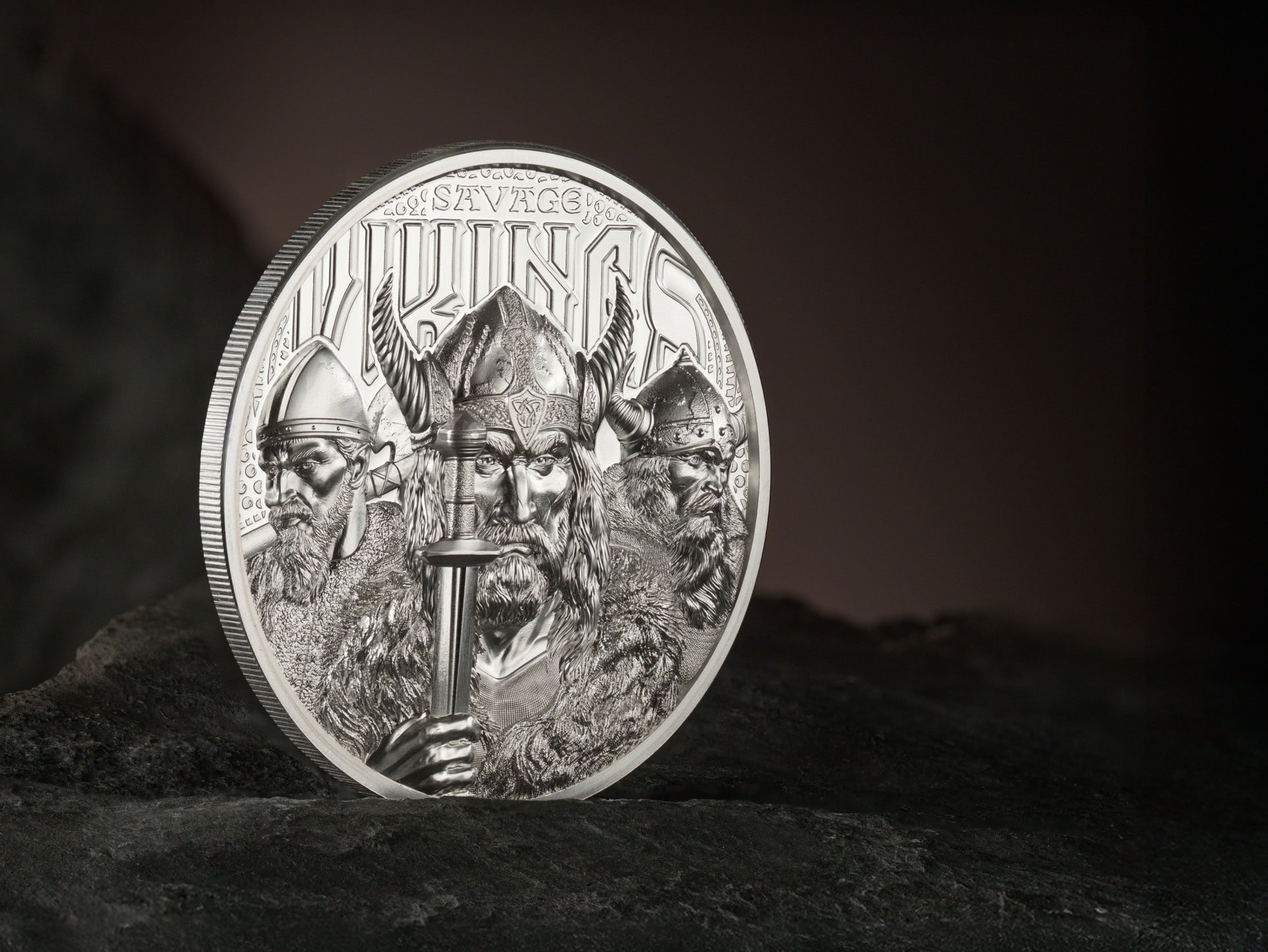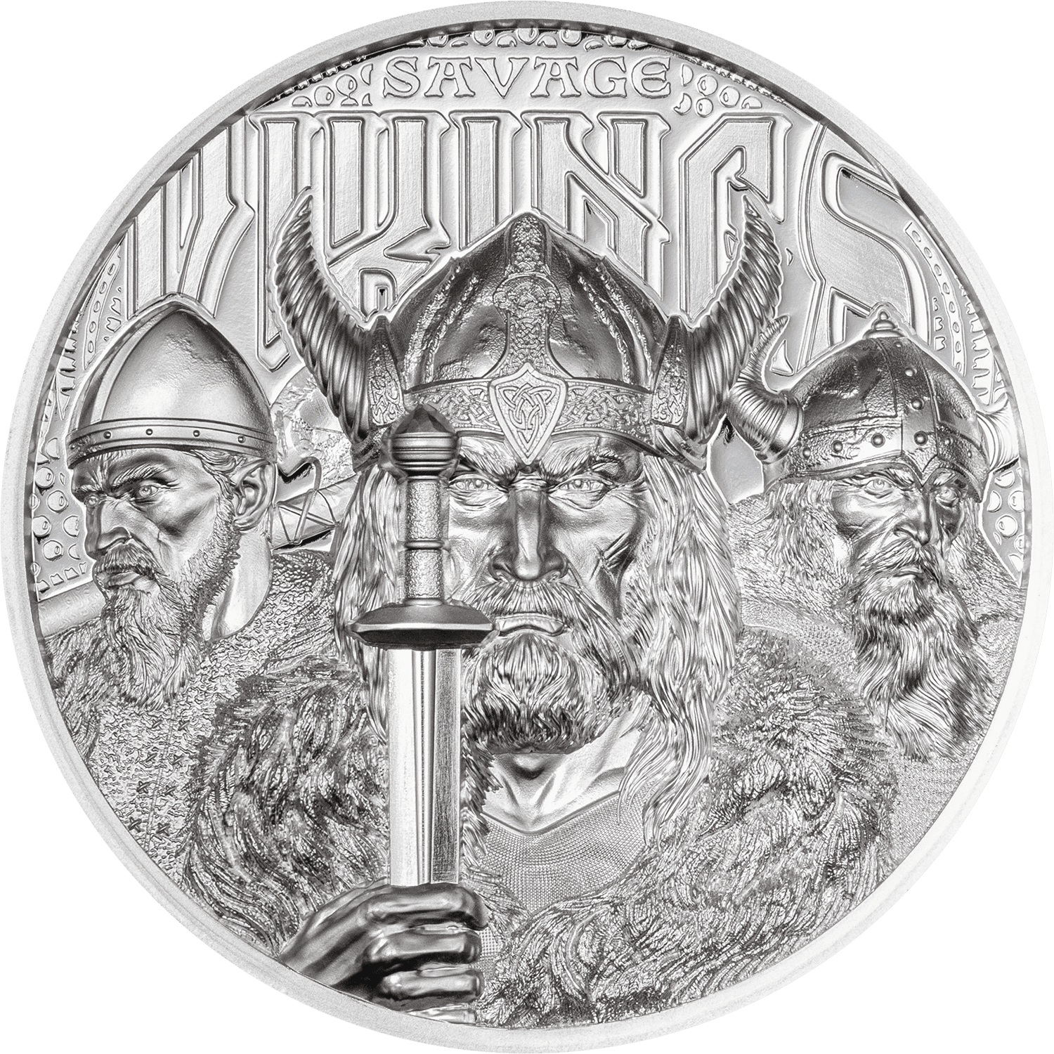 This coin impressively depicts all three figures in ultra-high relief. Their aggressive facial expressions and weapons clearly convey the message: we are ready for anything. The background pattern represents the sacred halls of Valhalla, a resting place for fallen warriors in Nordic mythology.