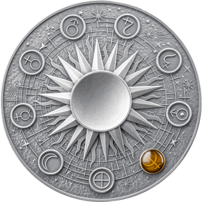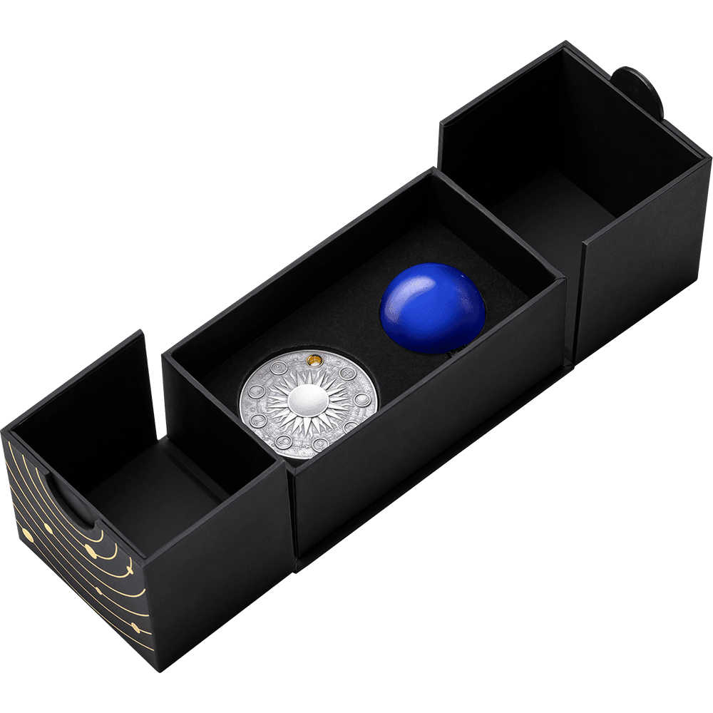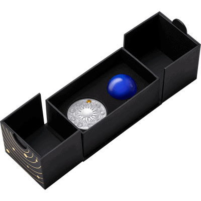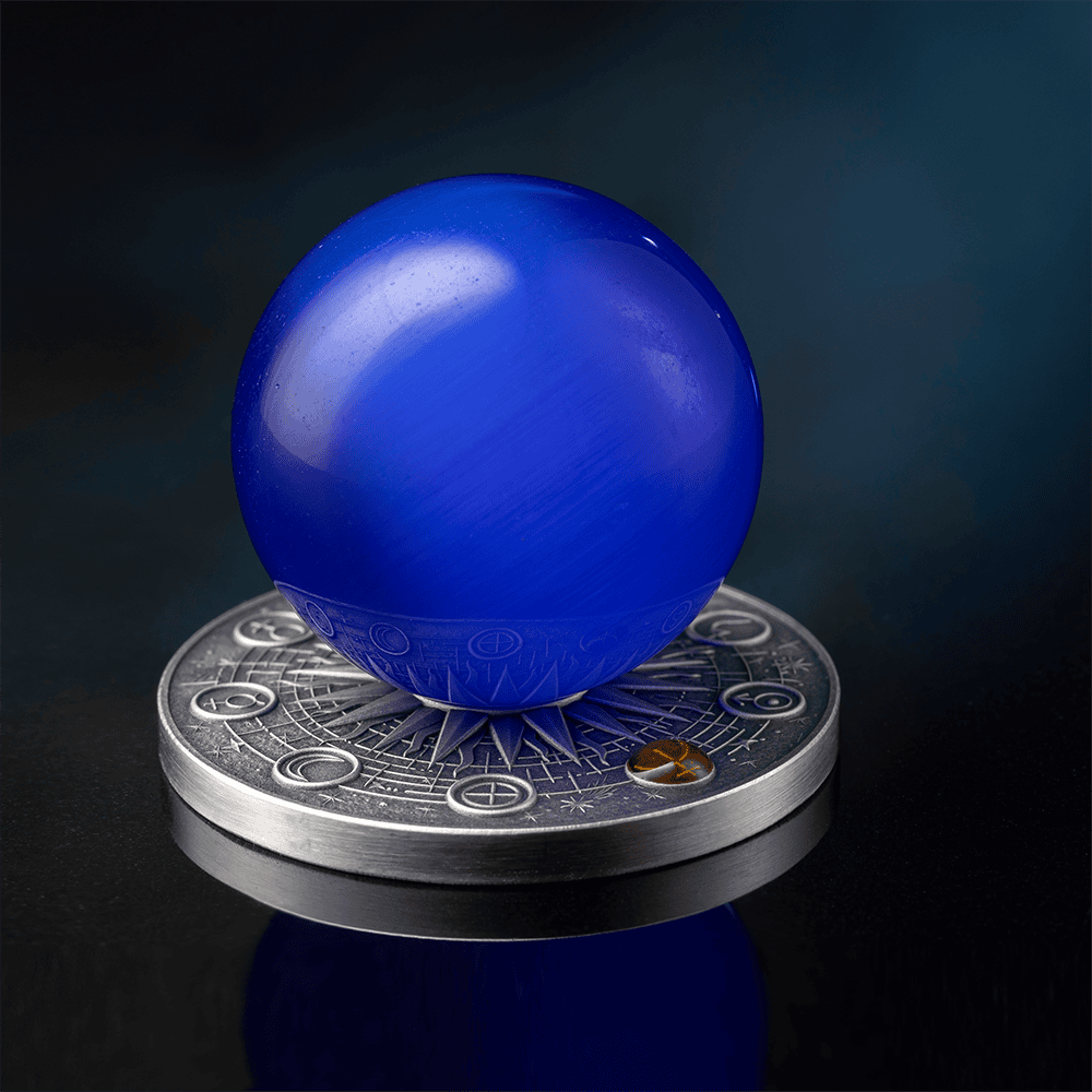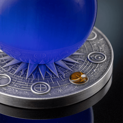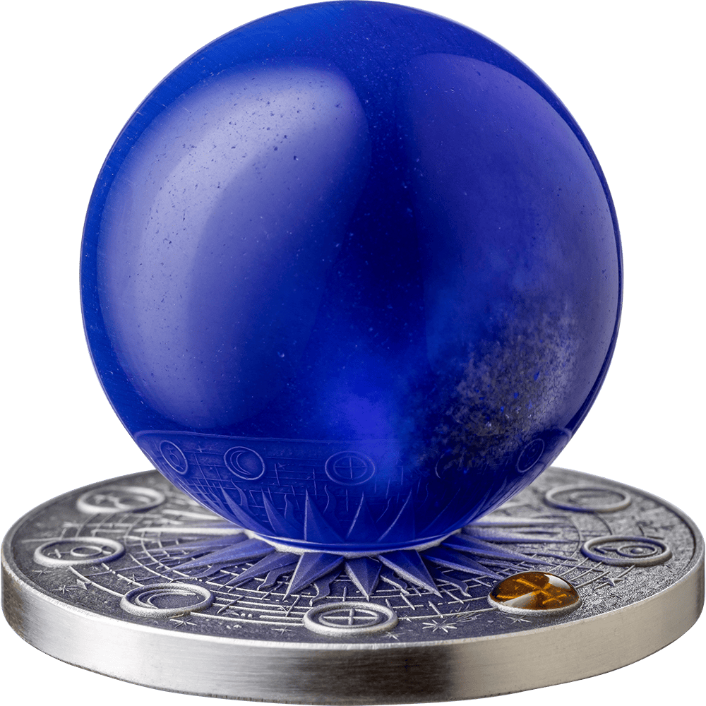 The 35-mm orb rests atop a 2 oz silver coin, sculpted in high relief and enhanced with digital