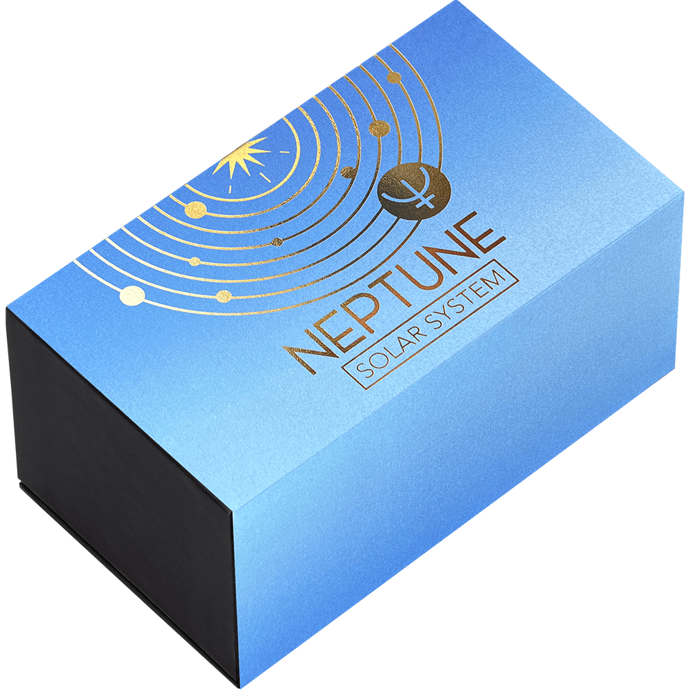 gilding. On the reverse, Neptune’s astronomical symbol glows from the shadows, echoing the