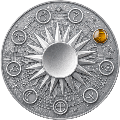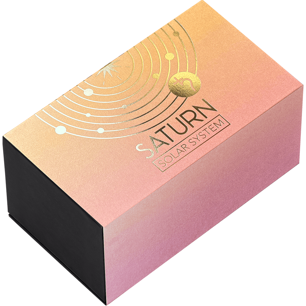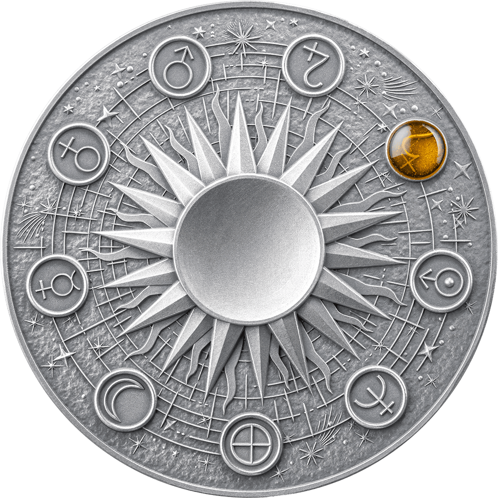 A 2 oz high-relief silver coin forms the base, highlighting Saturn’s astronomical symbol on