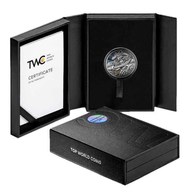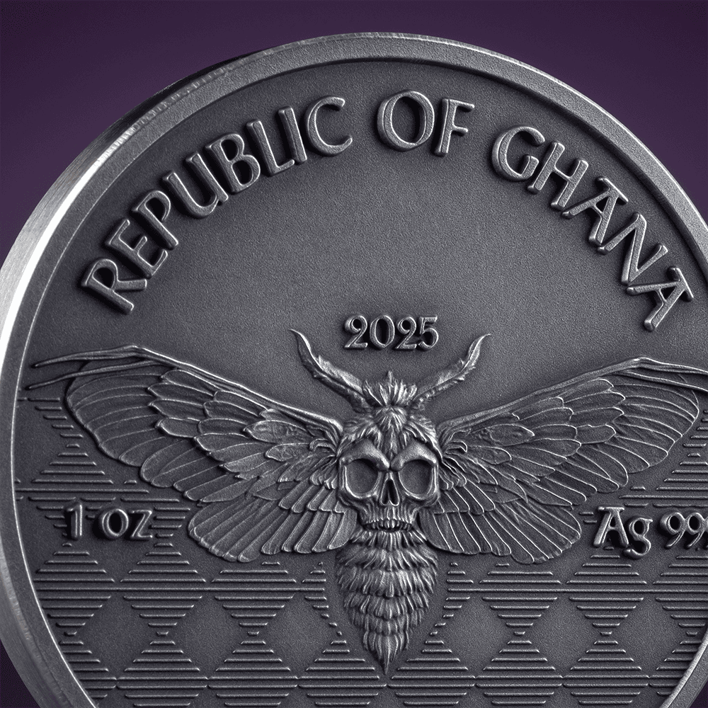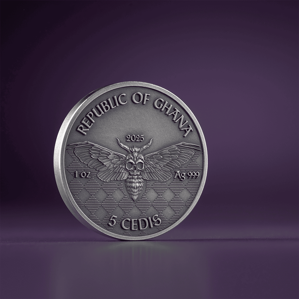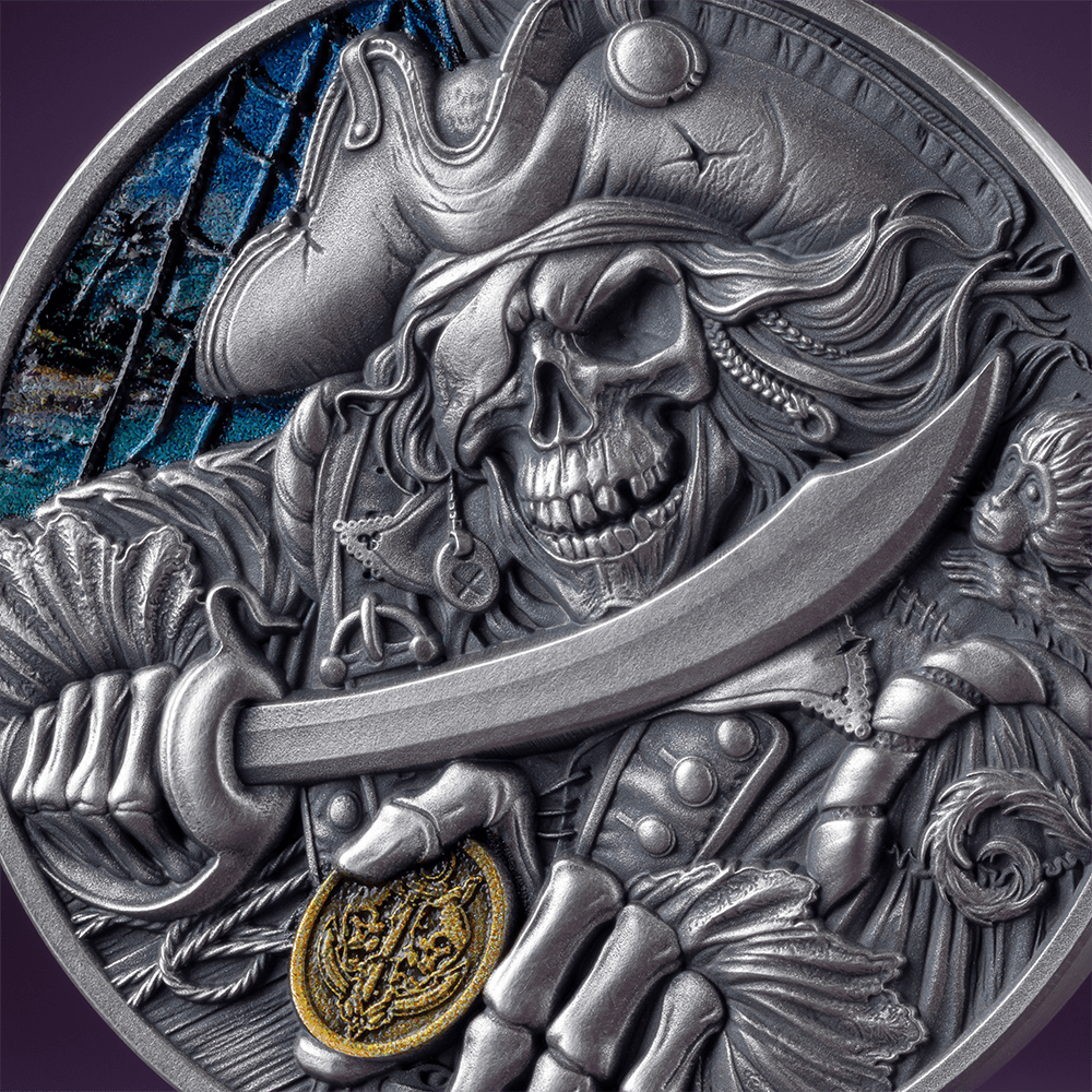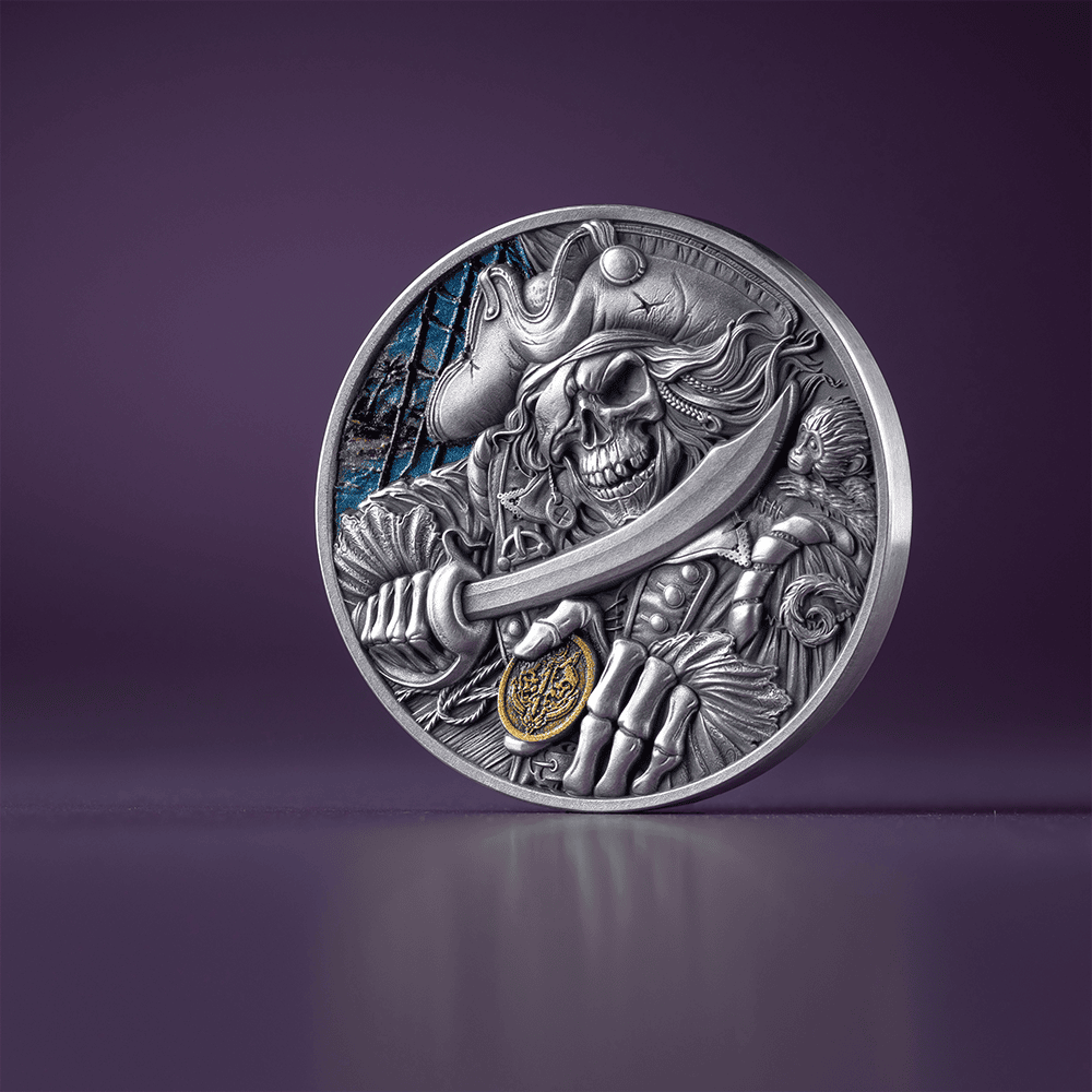 The 2025 Memento Mori – Pirate Coin is a 1 oz high-relief silver masterpiece that tells the story of a corsair whose days of plunder are long gone, yet whose legend endures. Struck from .999 fine silver and finished in antique detail with vivid digital printing, the design portrays a skeletal pirate gripping his blade and a cursed coin, his ghostly grin hinting at adventures long past. Behind him, the restless sea whispers of forgotten islands and hidden treasures, evoking the timeless allure of the pirate’s life. Issued by the Republic of Ghana with a face value of 5 Cedis, this 32 mm collectible is limited to only 999 pieces worldwide. A striking tribute to fleeting fortune and the eternal echo of high-seas adventure, it’s a must-have for fans of maritime lore and bold numismatic art.