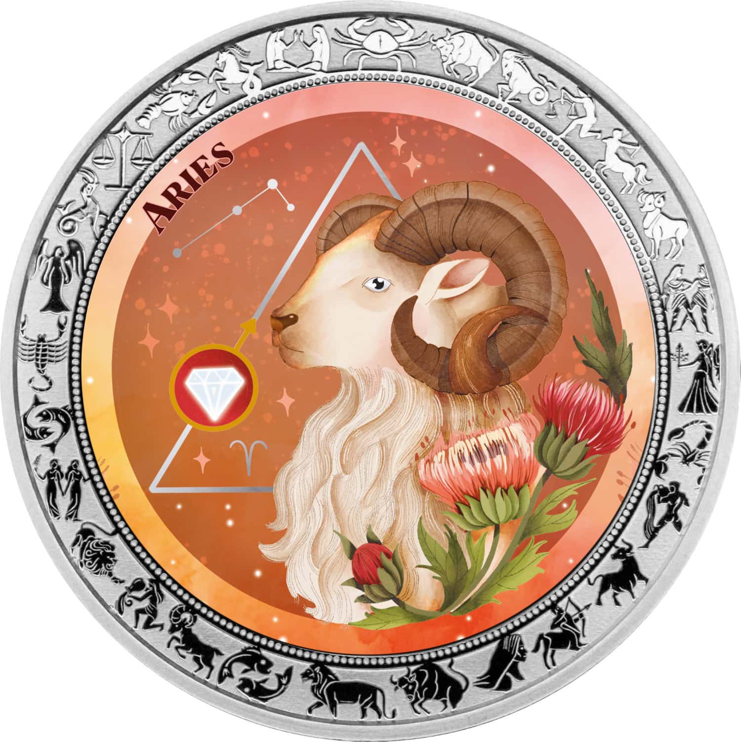 In the center of the reverse is a detailed aquarelle depiction of the Aries zodiac sign, showcasing a ram with flowing features and natural elements. The name “Aries” is incorporated into the design. Surrounding the central motif is a complete ring of all zodiac symbols, reinforcing the full astrological cycle.