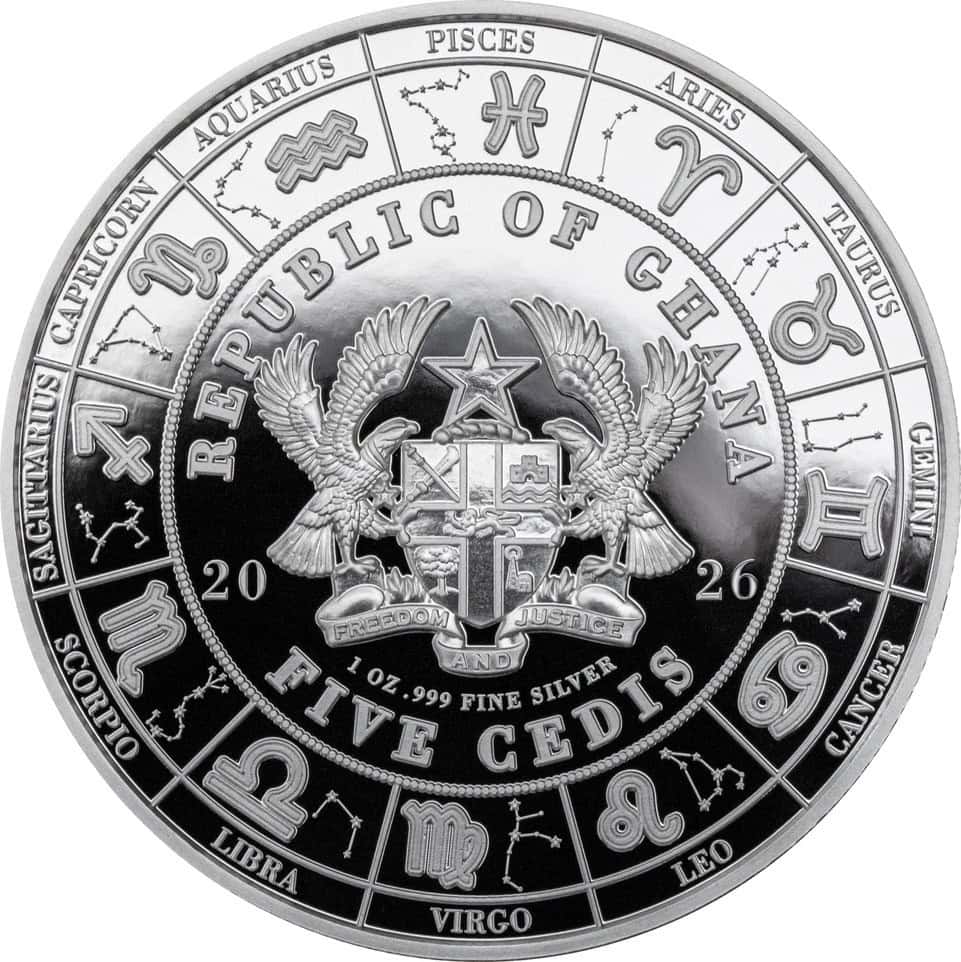 The obverse side of the coin features the Coat of Arms of the Republic of Ghana at its center. Surrounding the Coat of Arms is a complete zodiac calendar, with all twelve zodiac icons arranged in a circular pattern. The inscriptions include: “REPUBLIC OF GHANA” (the issuing country), “2026” (the year of issue), and “FIVE CEDIS” (the face value).