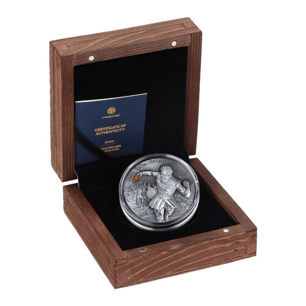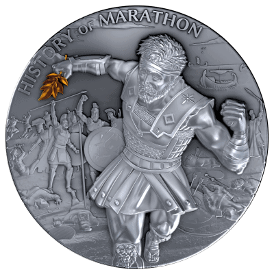 The marathon’s roots trace back to ancient Greece and the legendary run of Pheidippides, who sprinted over 42 kilometers from Marathon to Athens in 490 BC to announce victory over the Persians, collapsing and dying afterward. This act of endurance, sacrifice, and patriotism inspired the creation of the modern marathon at the 1896 Olympic Games, linking modern athletics to ancient heroism. Today, marathons have become global events celebrating perseverance and determination, echoing Pheidippides’ journey in every runner’s stride. A 2 oz collectible silver coin honors this legacy with stunning detail: the reverse shows the Persians fleeing while Pheidippides begins his run, and the obverse captures him nearing Athens, greeted by cheering locals beneath the Parthenon. Rich in symbolism and historical tribute, the coin vividly brings the story to life, making it both a meaningful keepsake and a powerful reminder of how courage and purpose can turn even the longest journeys into lasting triumphs.