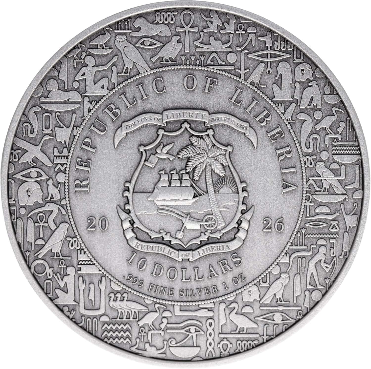 The obverse side of the coin features the coat of arms of the Republic of Liberia, surrounded by various Egyptian-related motif icons. The coat of arms includes the inscriptions: “REPUBLIC OF LIBERIA” (the issuing country), “2026” (the year of issue), and “10 DOLLARS” (the face value).