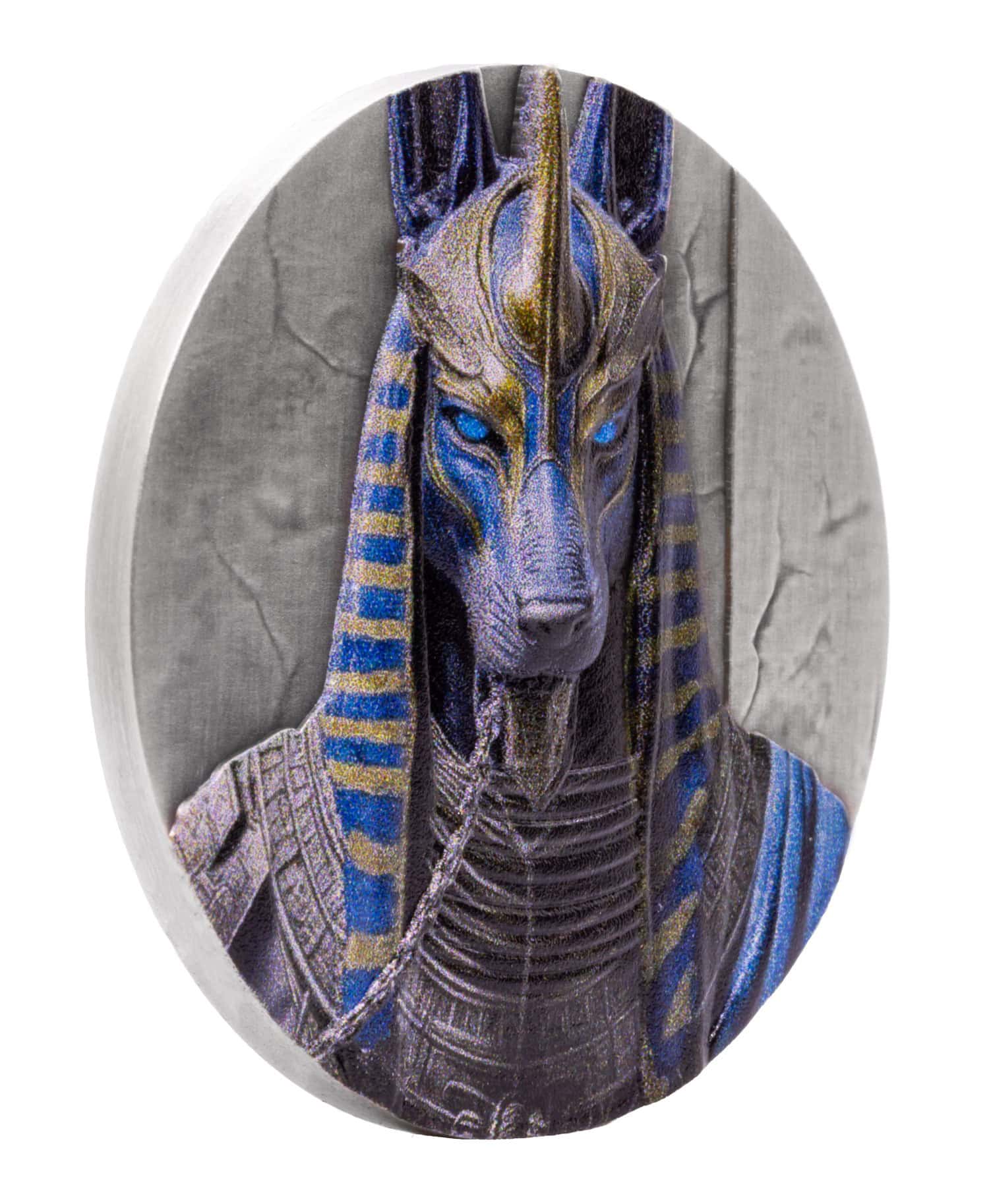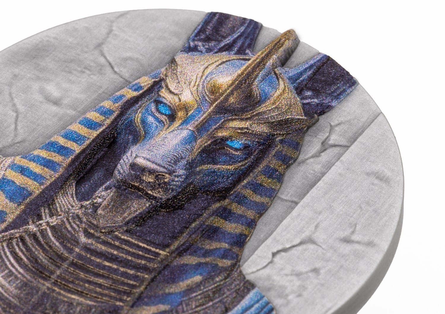 In the middle of the reverse is a striking depiction of Anubis in Ultra High Relief, enhanced with selective color that highlights the jackal-headed god with dramatic contrast and lifelike presence. The powerful portrait focuses entirely on the guardian of the afterlife, allowing the sculptural depth and detailed textures of the relief to stand out.