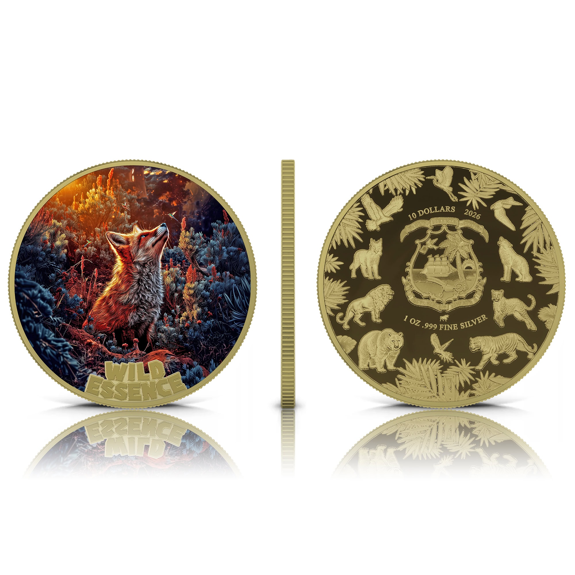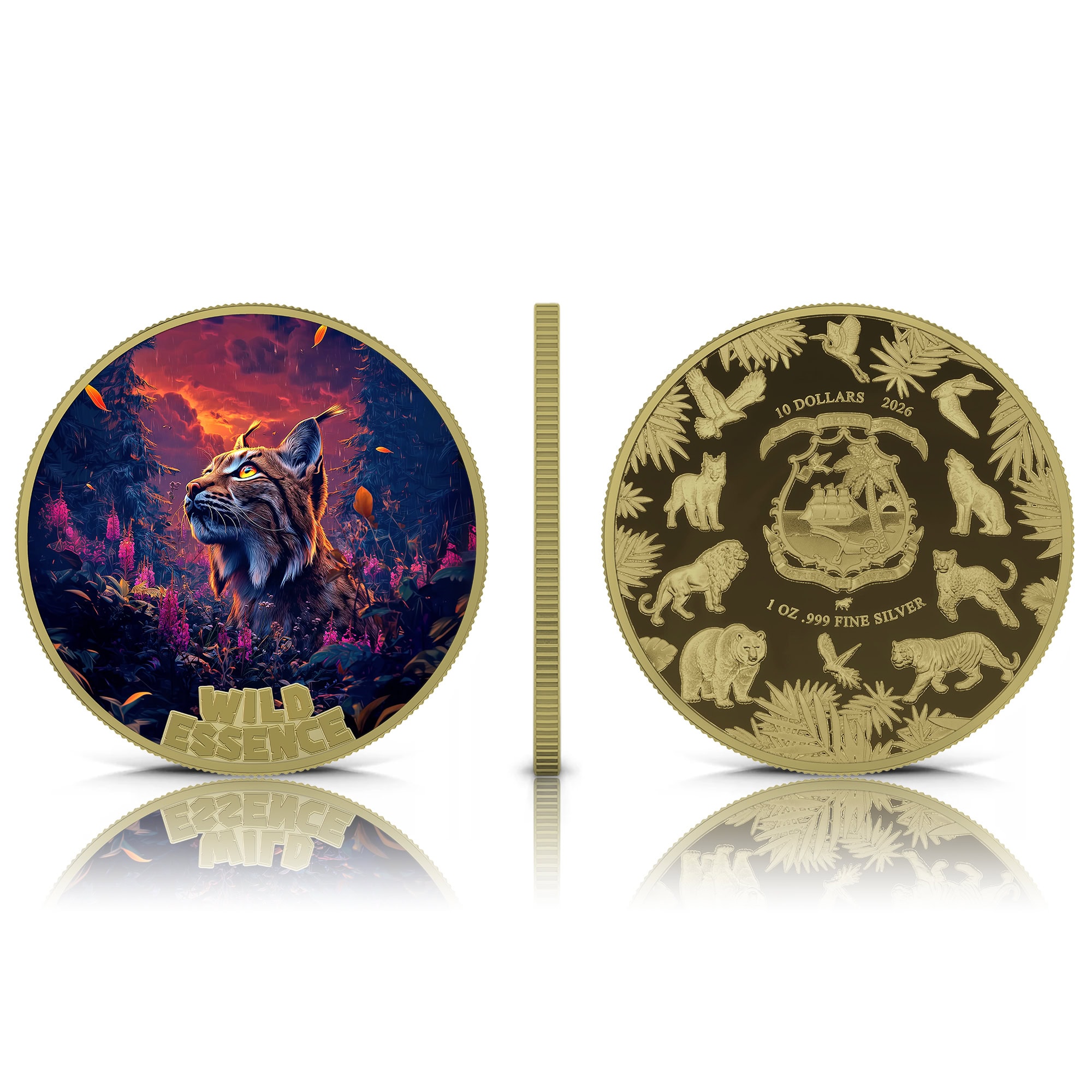 Liberia – 2026 – 5x 10 Dollars – African Lion, Wolf, Fox, Lynx, Sumatran Tiger (Wild Essence series) 5x 1oz silver GILDED