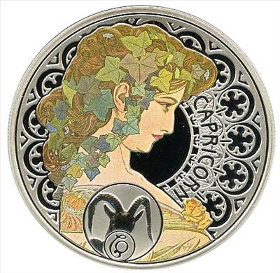 Silver commemorative coins from Alfons Mucha – Zodiac series (consisting of twelve coins) have been issued by the Niue Philatelic and Numismatic Company, the Monetary Authority of the Government of Niue Island in connection with the 150th anniversary of the great Painter. Coins issued in cooperation with and under license of Mucha Foundation.