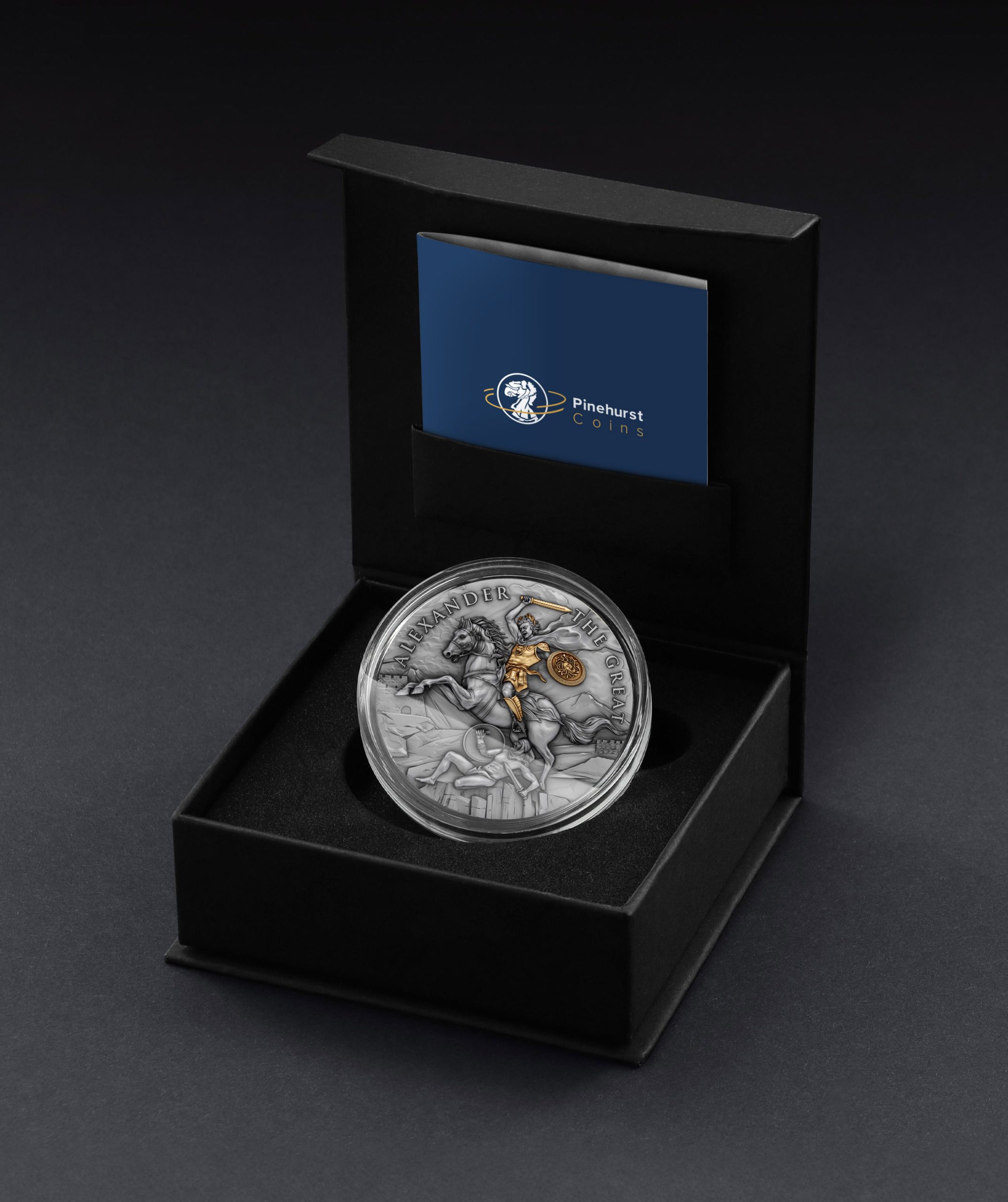 Meet Alexander the Great—the legendary Macedonian king and military genius whose conquests reshaped the ancient world. Born in 356 BCE, Alexander ascended to the throne at just 20 and embarked on an unprecedented campaign that stretched from Greece to Egypt and as far as India. Undefeated in battle, he founded over 20 cities and spread Hellenistic culture across three continents, leaving a legacy that shaped history, philosophy, and governance for centuries. This epic life is now honored in a masterfully crafted 2 oz .999 fine silver coin, struck in high relief with antique finish and selective gold plating that highlights key details of the design. Issued by Niue in 2023, the coin measures 45 mm in diameter, carries a face value of 5 Dollars, and is strictly limited to 500 pieces worldwide. Each comes with a certificate of authenticity and presentation case—an iconic tribute to one of history’s greatest conquerors.