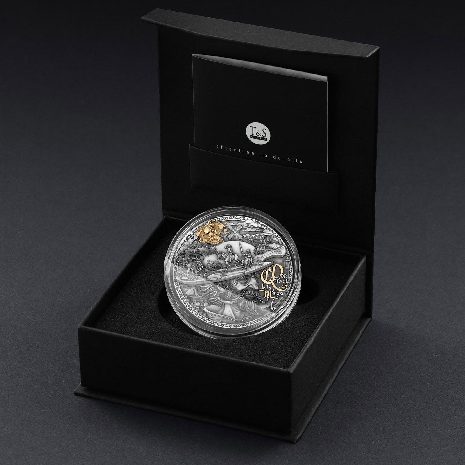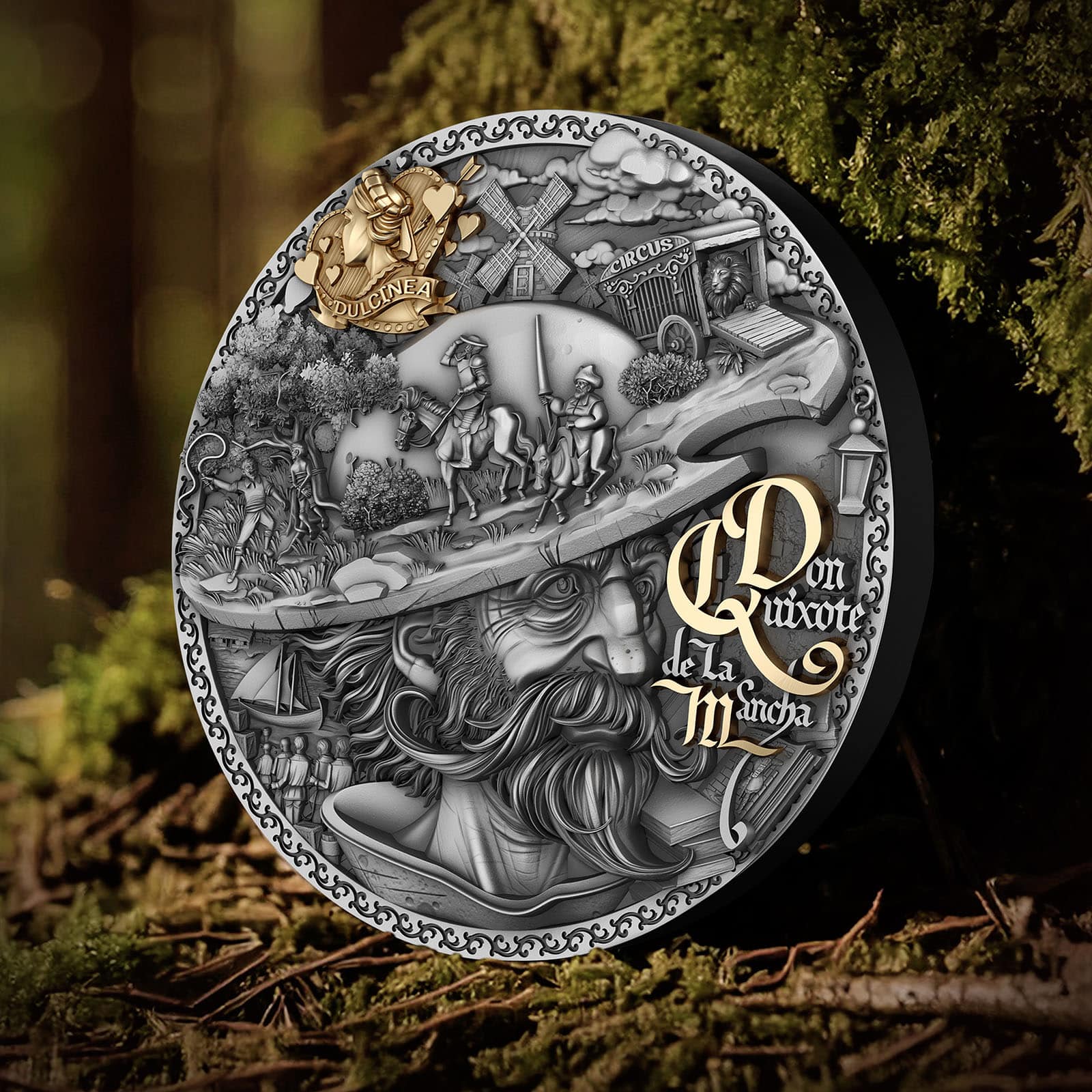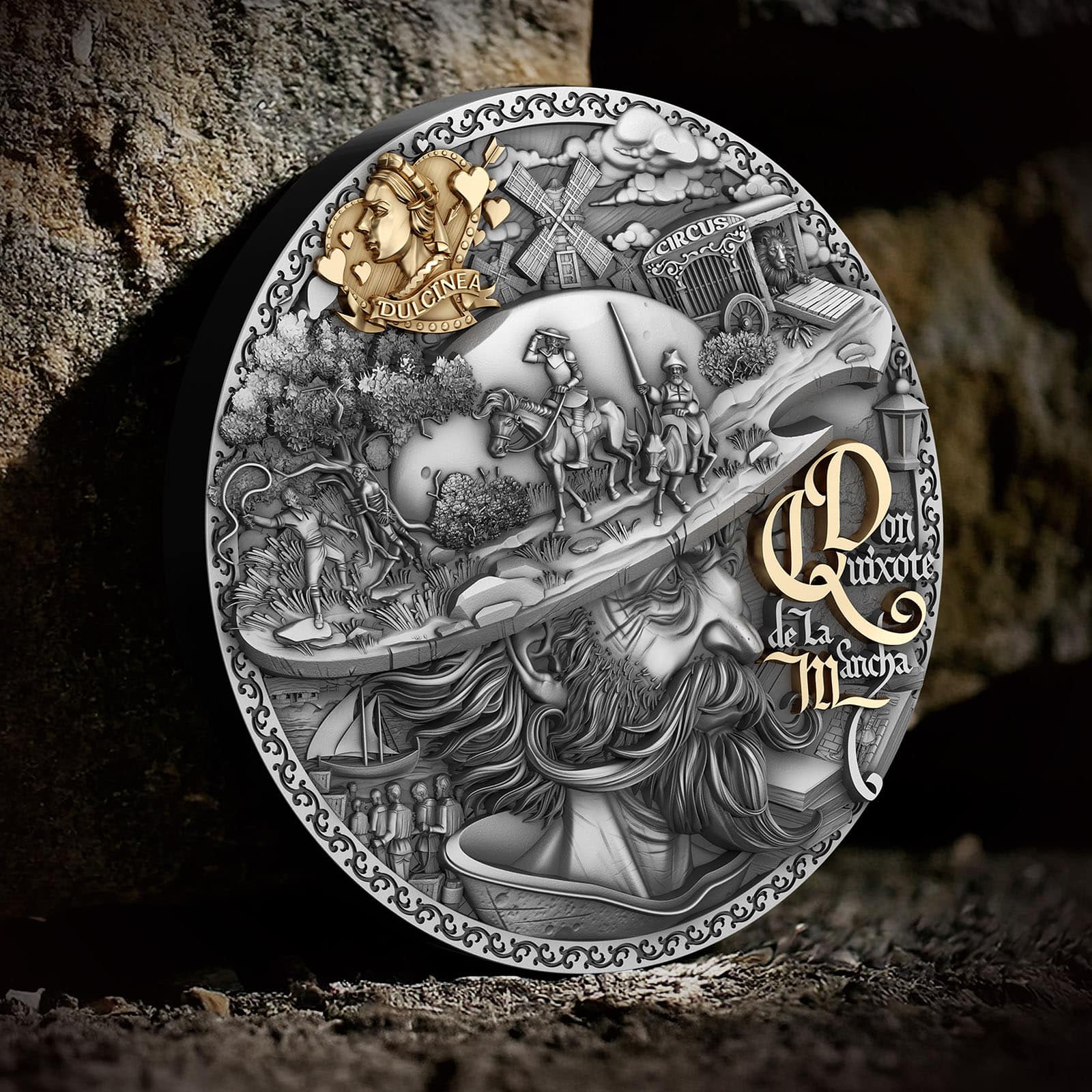 The coin’s intricate high-relief design brings this legendary story to life, inviting you to embrace the extraordinary, to dream boldly, and find strength in your ideals – just as Don Quixote did. And gold-accented image of his muse, Dulcinea, represents the beauty of unattainable dreams – those that inspire us to push forward, no matter the odds.