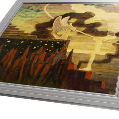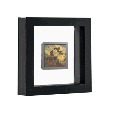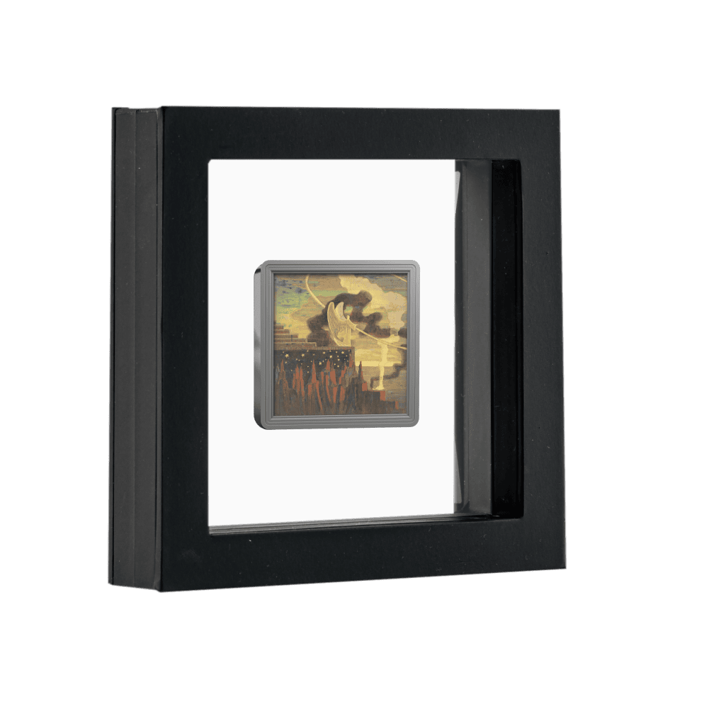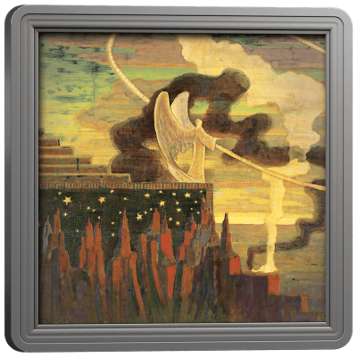 “The Offering” is a symbolic and visually rich painting by Lithuanian artist Mikalojus Konstantinas Čiurlionis, a key figure in early 20th-century European modernism. Created in the 1900s, the artwork reflects the symbolist movement, focusing not on religious literalism but on deeper interpretations of ideas and archetypes. At its center stands an angel, embodying themes like hope, love, faith, and sacrifice. The painting’s elements—mystical stairs, colorful rising smoke or incense, a large floating ring, and hidden stars—invite the viewer into a dreamlike, contemplative experience. Now captured on a coin, The Offering serves not only as an aesthetic marvel full of symbolic depth but also as a valuable numismatic item. This unique combination makes it a meaningful and elegant addition to any art or coin collection, offering visual intrigue and intellectual engagement in equal measure.
