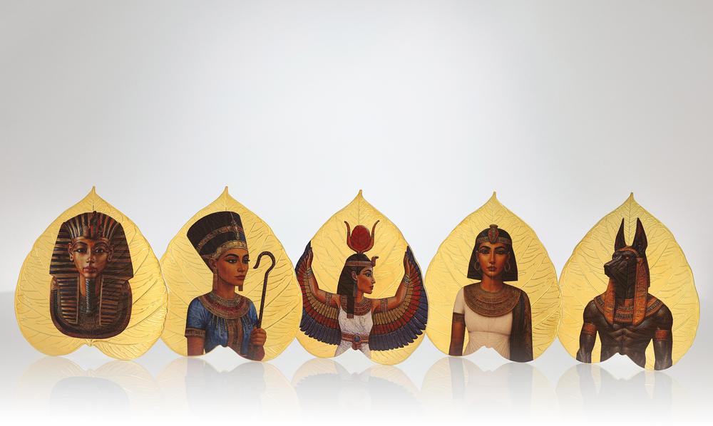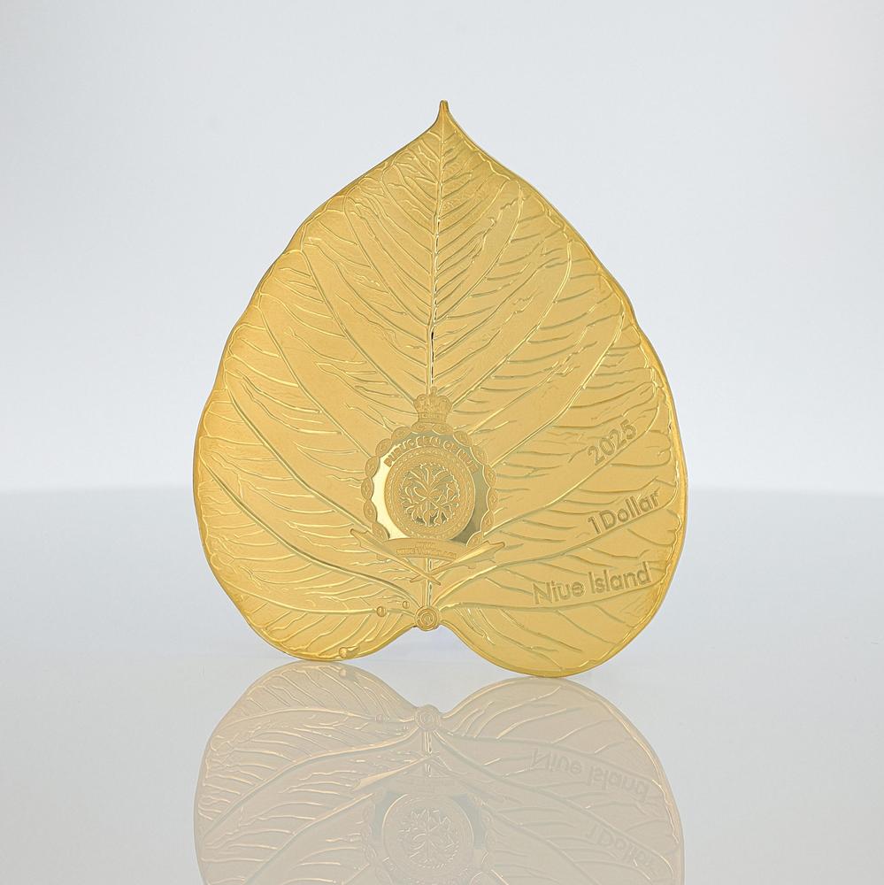 This extraordinary 1 oz Silver coin from the “Leaves of the Nile” series honors Anubis, the Egyptian god of the afterlife and silent guardian of tombs. Struck in the sacred shape of a Bodhi leaf, it fuses the mysticism of Egypt with the spiritual grace of Indian artistry. Anubis, with his jackal gaze, stands as the eternal judge who weighs the heart against the feather of truth—his power echoing through shadow and eternity. The coin’s Proof finish gleams like desert light upon temple walls, revealing every vein of the sacred leaf. On the reverse, Anubis commands the scene: his form black as night, adorned with radiant gold plating, his eyes burning with divine judgment. The obverse bears the Public Seal of Niue, along with inscriptions “2025,” “1 DOLLAR,” and “Niue Island.” Struck from .999 fine silver and limited to just 99 pieces worldwide, this shaped masterpiece captures the eternal breath of the Nile—an immortal relic of faith, power, and truth.