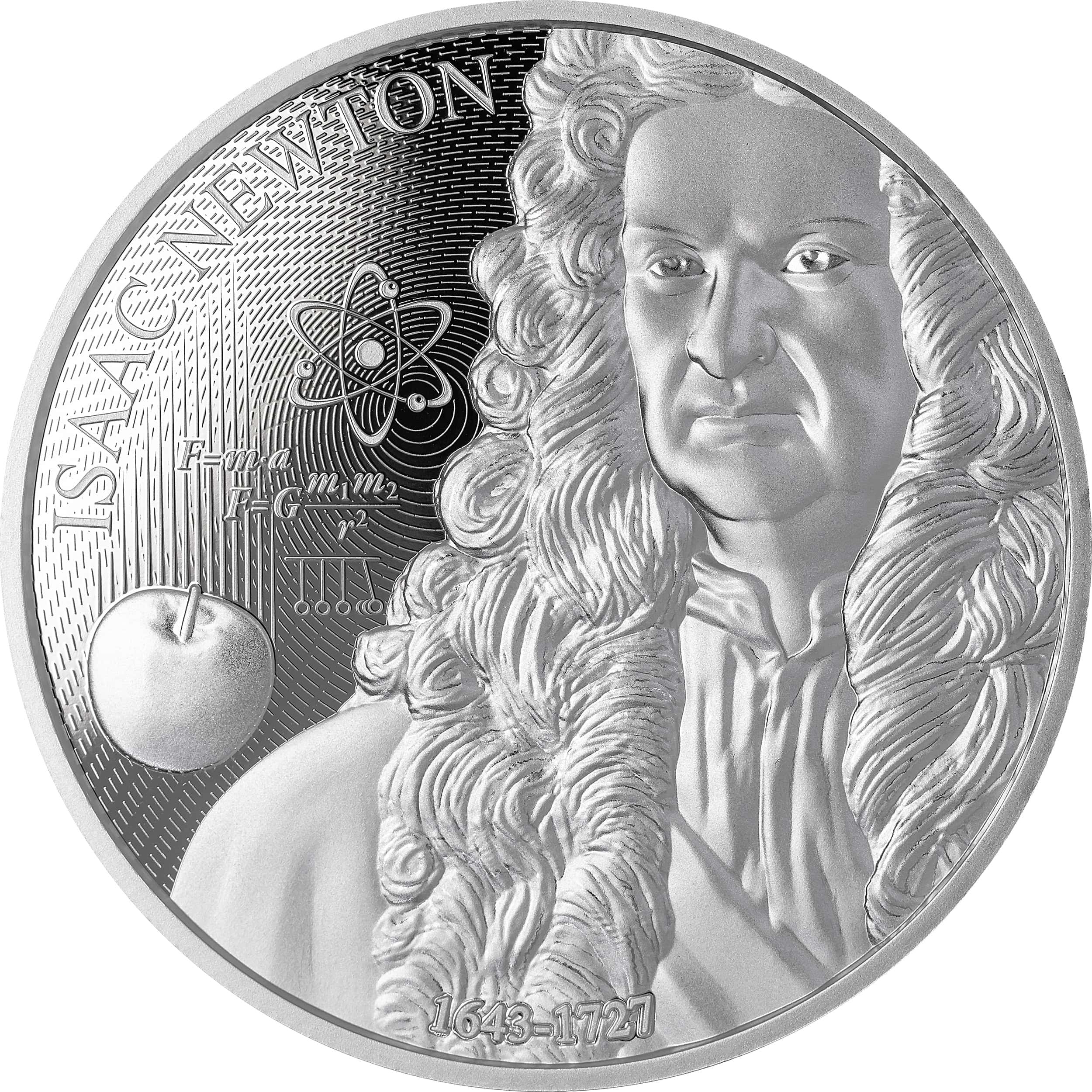 The reverse showcases a detailed portrait of Isaac Newton on the right, with his name and life dates (1643–1727) inscribed at the far edge. On the left side, a falling apple symbolizes the moment that inspired Newton’s thinking about gravity. Surrounding the scene are scientific formulas and diagrams, including the law of universal gravitation, visually illustrating the discovery that changed our understanding of the forces governing the universe.
