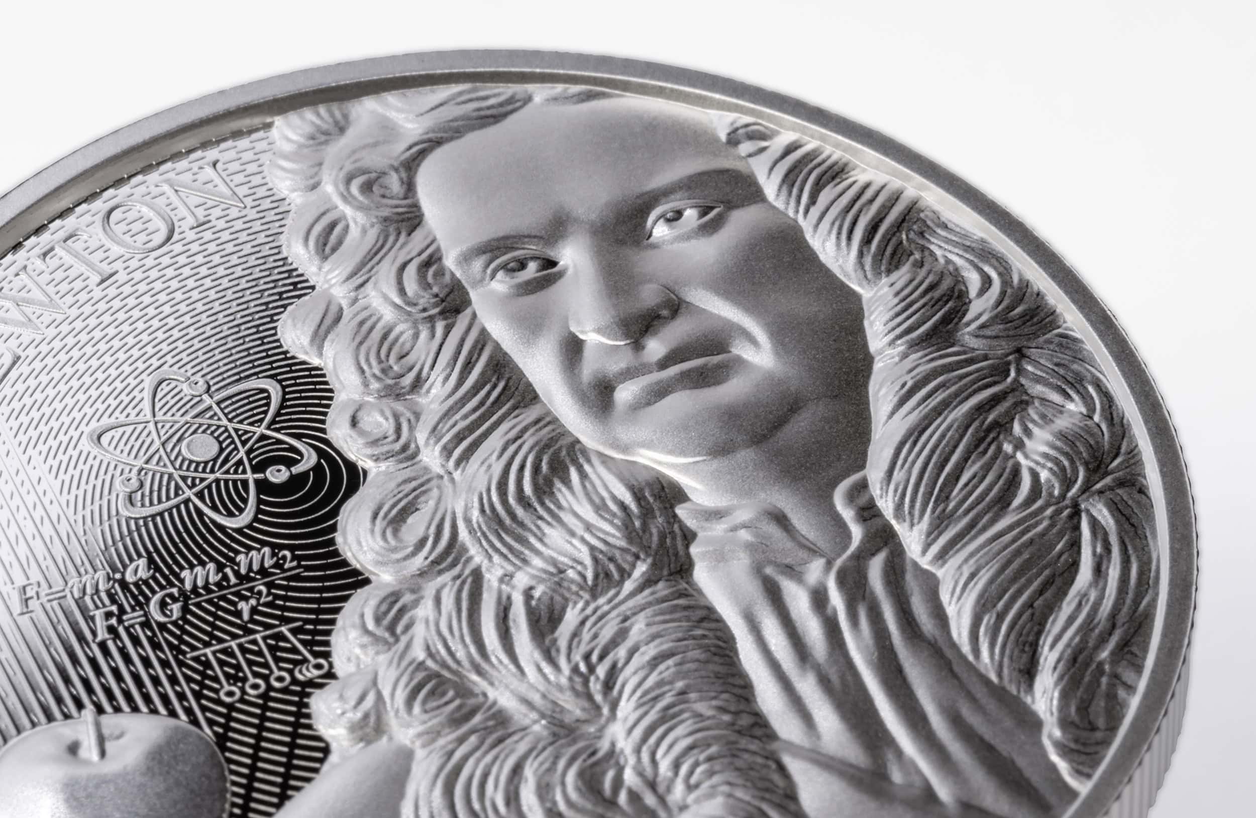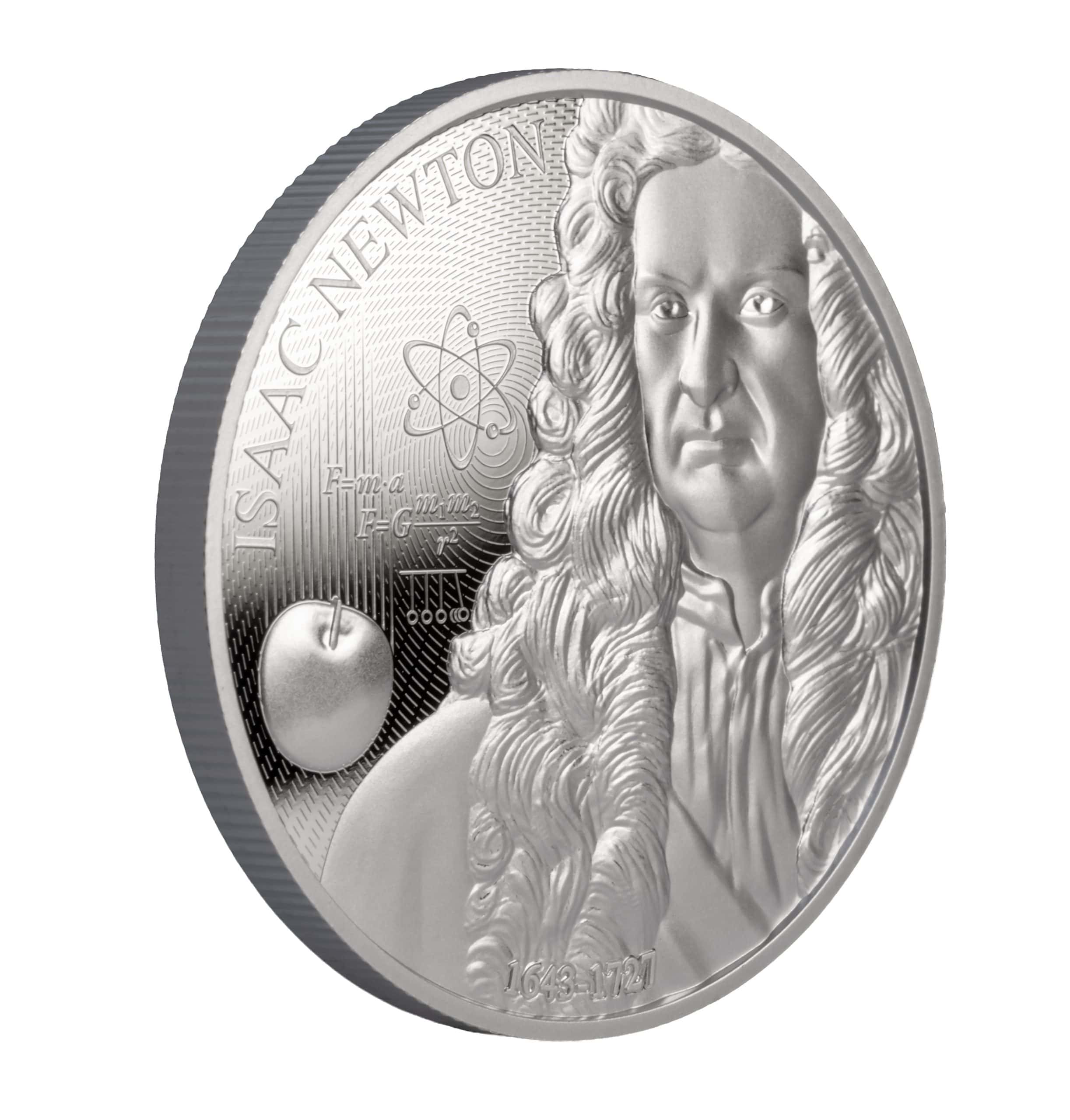 The coin is struck in a high-quality PROOF finish and comes in a blister pack with a certificate of authenticity, which also explains Newton’s law of gravitation.