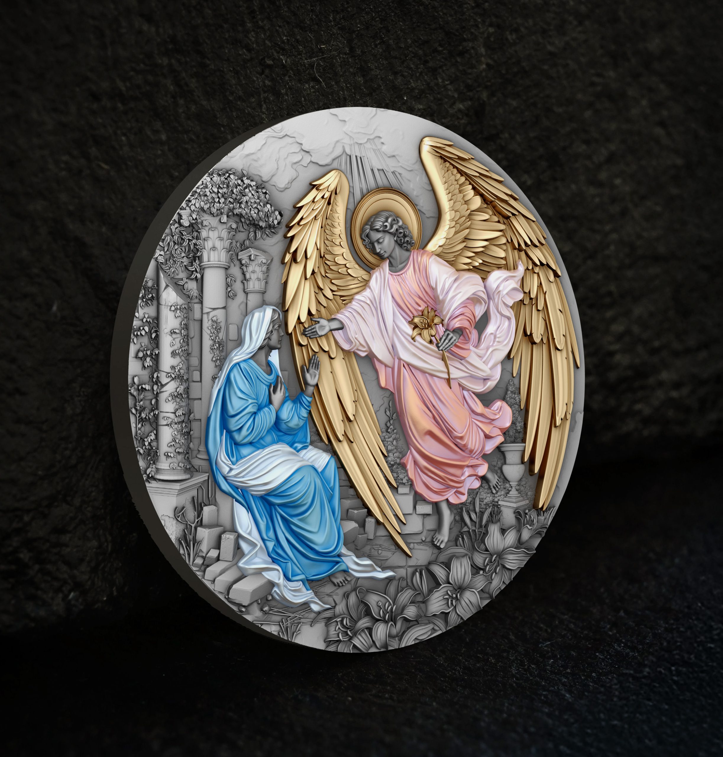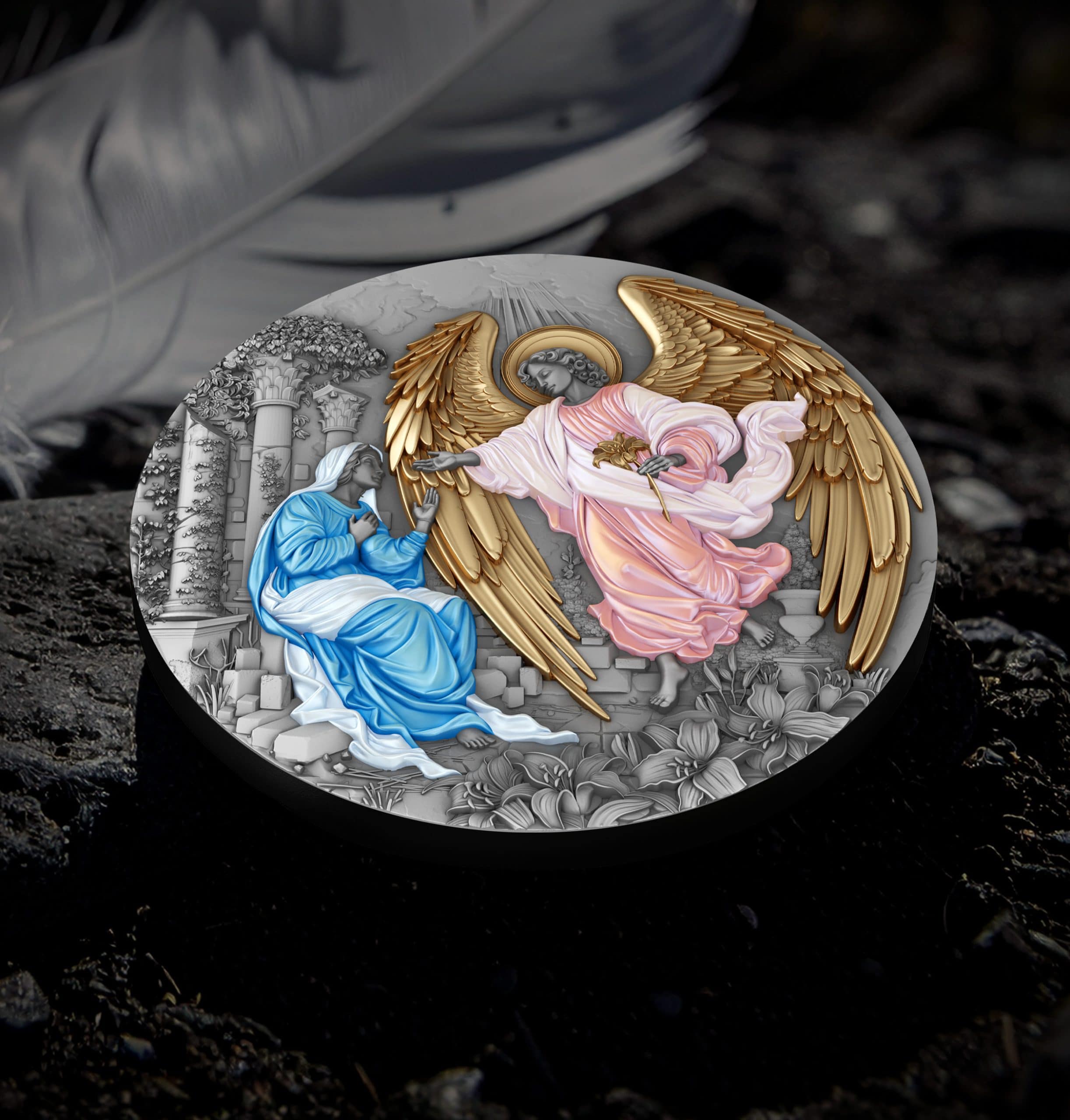 From the very first verses of Scripture, hope was set in motion. “Gabriel – The Herald of Salvation,” the second release in the Archangels series, honors the sacred moment when heaven touched earth: the Annunciation. As the Virgin Mary humbly receives the divine message—”You will conceive and bear a Son, and you shall call His name Jesus”—the Archangel Gabriel extends a lily, symbol of purity and peace. With .999 pure silver, this 2 oz coin from Niue captures this transformative encounter with intricate artistry: Gabriel’s halo, wings, and the gilded lily glow with selective gold plating, while high-relief minting brings every detail to life. The design radiates spiritual depth, framed within an antique finish and enhanced by vivid contrast. Issued in 2025 with a limited mintage of only 500 pieces, this 45 mm collector’s coin includes a certificate of authenticity and presentation case. More than a numismatic piece, it is a timeless tribute to divine promise—an emblem of peace, redemption, and sacred grace etched in silver and gold. Let this coin serve as a reminder that even in silence, heaven speaks.