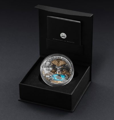 A glass bottle, firmly held in the hands of a pirate with a ship inside awaits. Its release marks the moment when courage triumphs over fear and destiny is set in motion. Only fearless with a black diamond ring can open the bottle and free the mystery and unknown destiny. And so coin depicts a pirate of unyielding strength, with a genuine black diamond ring on his hand—as a symbol of power and strength—which protects and leads the owner with courage, empowering him to claim his fate.