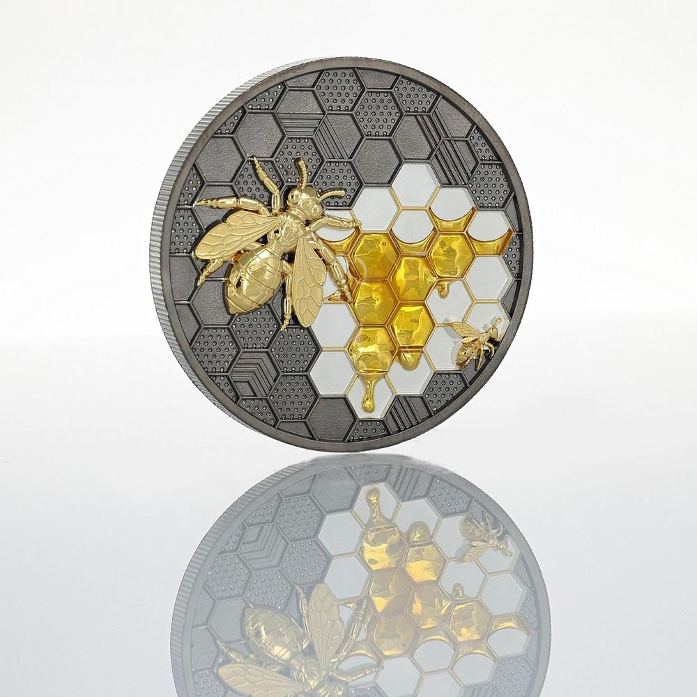 At the center, a bionic bee emerges within a geometric hive, where flowing gold replaces natural honey, symbolizing transformation and power. The composition blends organic inspiration with mechanical precision, creating a bold and immersive scene. More than a collectible, this coin reflects a future shaped by innovation, where resilience and reinvention redefine the natural order.