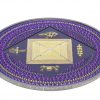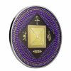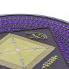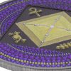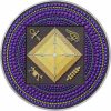 The reverse of the coin depicts an Egyptian pyramid in the centre of the coin with four symbols around it. The Eye of Horus, the symbol Ankh. The design is completed with circles in various sizes of dots in both purple tints and yellow.