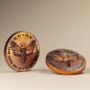 The reverse of the coin features a moth, a nocturnal flying insect with two pairs of broad wings very similar to a butterfly. The moth is represented with a skull on her back, with the body in Ultra High Relief. All around the moth, the letters of the palindrome latin phrase “in girum imus nocte et consumimur igni” are divided in two inscriptions. The fire is still composing the sentence from the palindrome letters engraved. This sentence means “we go round and round in the night and are consumed by fire”. The legend says that if you write this sentence on a parchment and you set it on fire, you’ll have the power to evoke the philosopher stone. On the bottom of the reverse, the inscription: “2023” – the year of issue. On the obverse, the body of the moth is excavated inside the coin showing the details of the body. All around the obverse, the palindrome latin sentence is engraved as if it were branded by fire. On the obverse, the Coat of Arms of Palau and the inscriptions: “republic of palau” – the country of issue and “20 dollars” – the face value. The innovative Industrial Proof Finish makes every coin unique, it will give to every coin an exclusive burning effect!