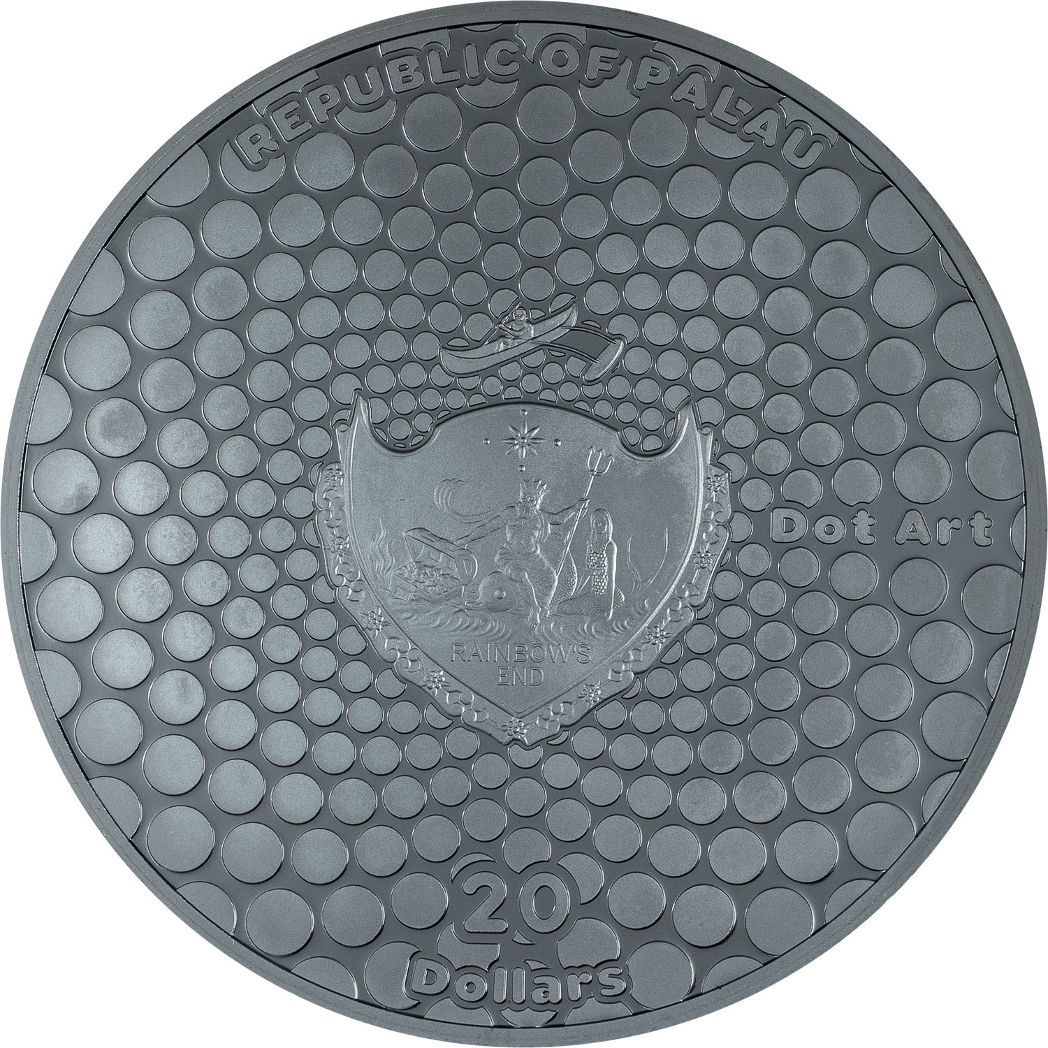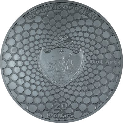 The obverse side of the coin depicts the unique coat of arms with the same dot-art and the inscriptions: “REPUBLIC OF PALAU” (the issuing country), “DOT ART” (the name of the series) and “20 Dollars” (the face value).