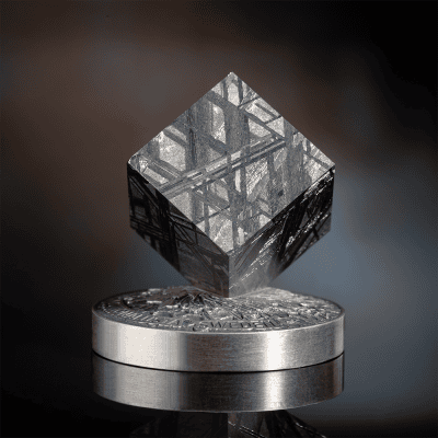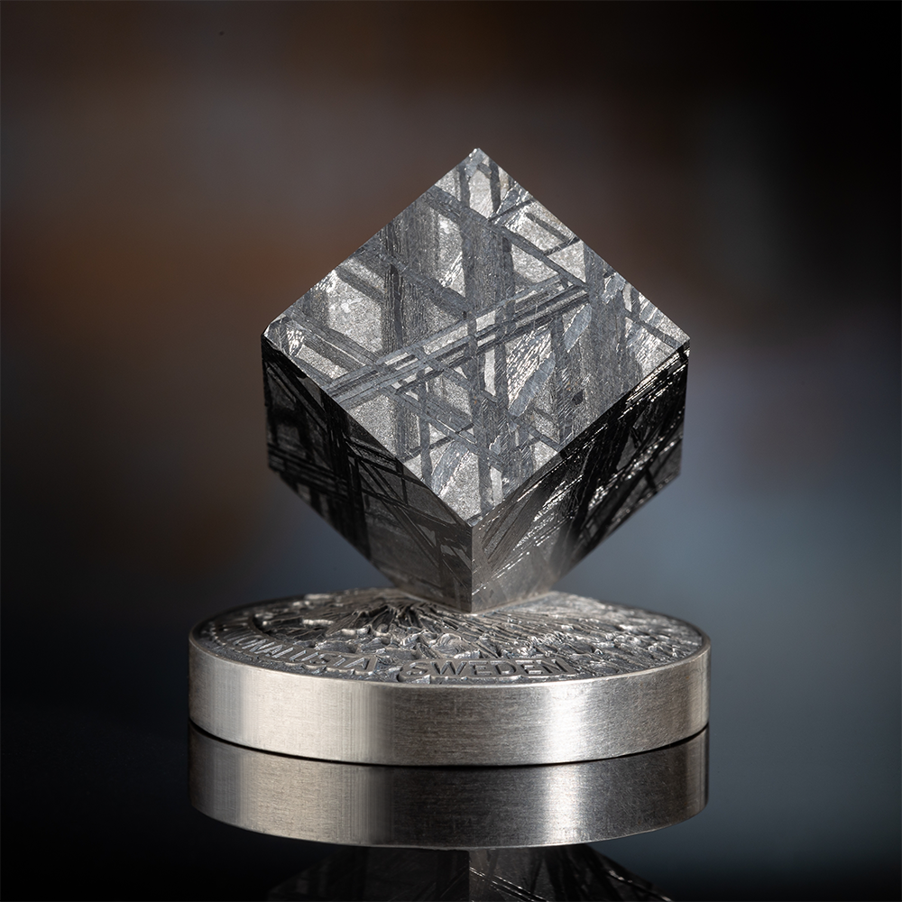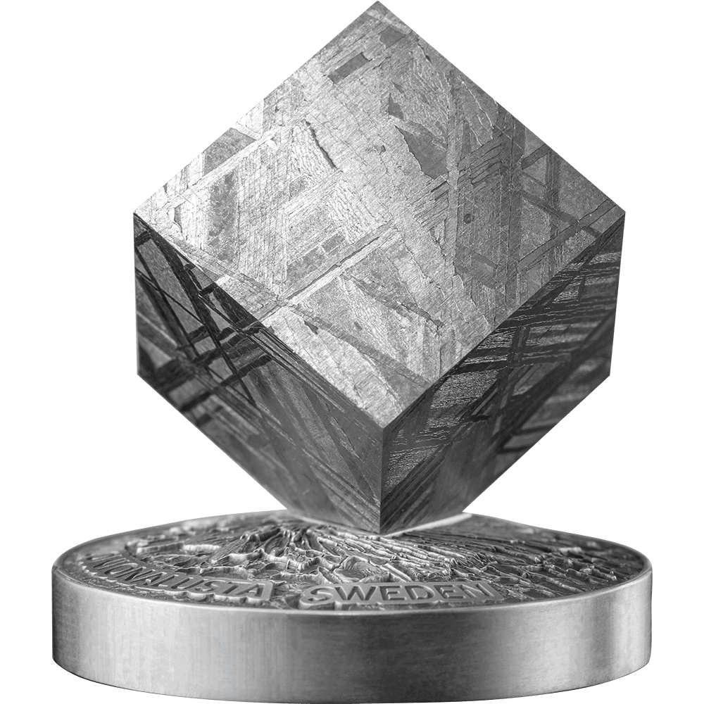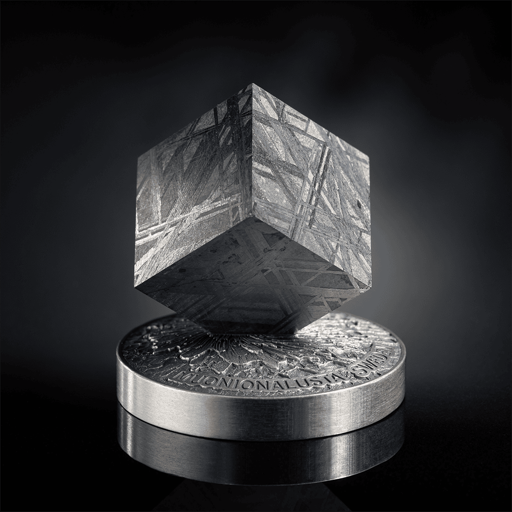 landscape. A 16×16 mm pure Muonionalusta meteorite cube is encased in the crater formed by the one-ounce silver