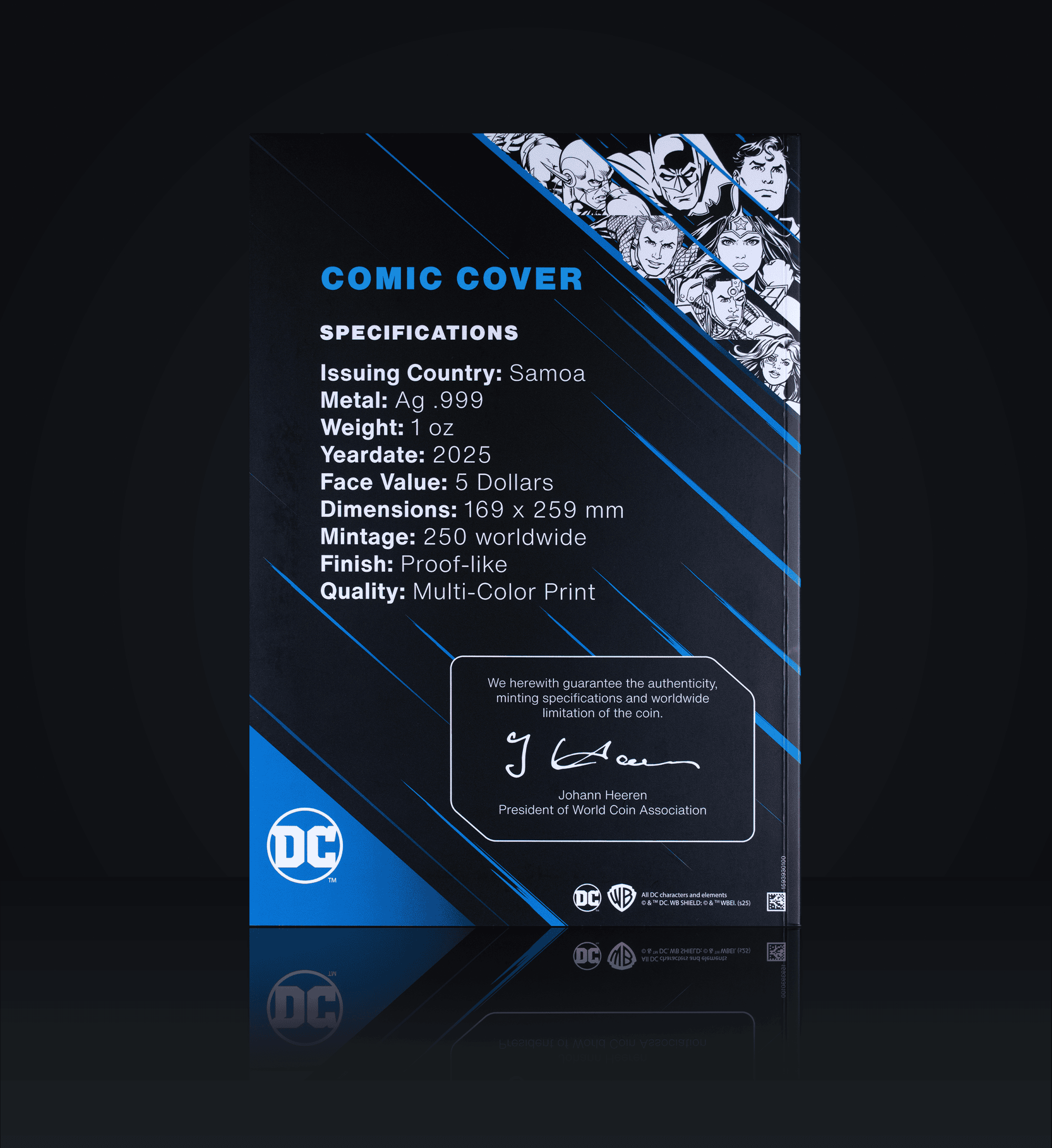 Step into the world of legendary superheroes with the officially licensed DC Comics Covers – Silver Foil Series, a premium collectible tribute to some of DC’s most iconic comic book covers. Each of the five unique designs is struck in 1 oz of .999 fine silver, enhanced with vivid multi-color print and a proof-like finish. Sized to match an actual comic (169 x 259 mm), these silver foils deliver stunning visual impact and are housed in a premium window display case with an individual Certificate of Authenticity. With a strict worldwide mintage of just 250 pieces per design, this series stands as one of the most exclusive licensed collectibles of 2025. The debut release features the unforgettable Batman #423 cover by Todd McFarlane, making it a must-have for fans and collectors alike. Secure your piece of comic book history—crafted in fine silver and brought to life with unmatched detail and artistry.