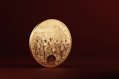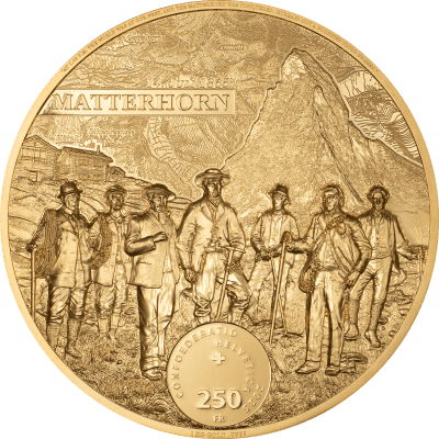 This coin tells the exciting and tragic story of the first ascent – with many details. The coin’s edge is engraved with Edward Whymper’s famous quote from the summit: «At 1.40 p.m. the world was at our feet, and the Matterhorn was conquered. Hurrah! Not a footstep could be seen.» Four of the seven members of the team lost their lives on the descent. These fearless men are immortalized on the reverse in their memory.