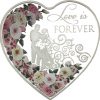 A classic wedding day scene with a loving couple, the new bride holding a bouquet and the words “Love is Forever” feature on this special coin. A beautiful border of white and pink roses representing a traditional wedding bouquet completes the design. This coin makes a perfect gift for any couple on their wedding day.